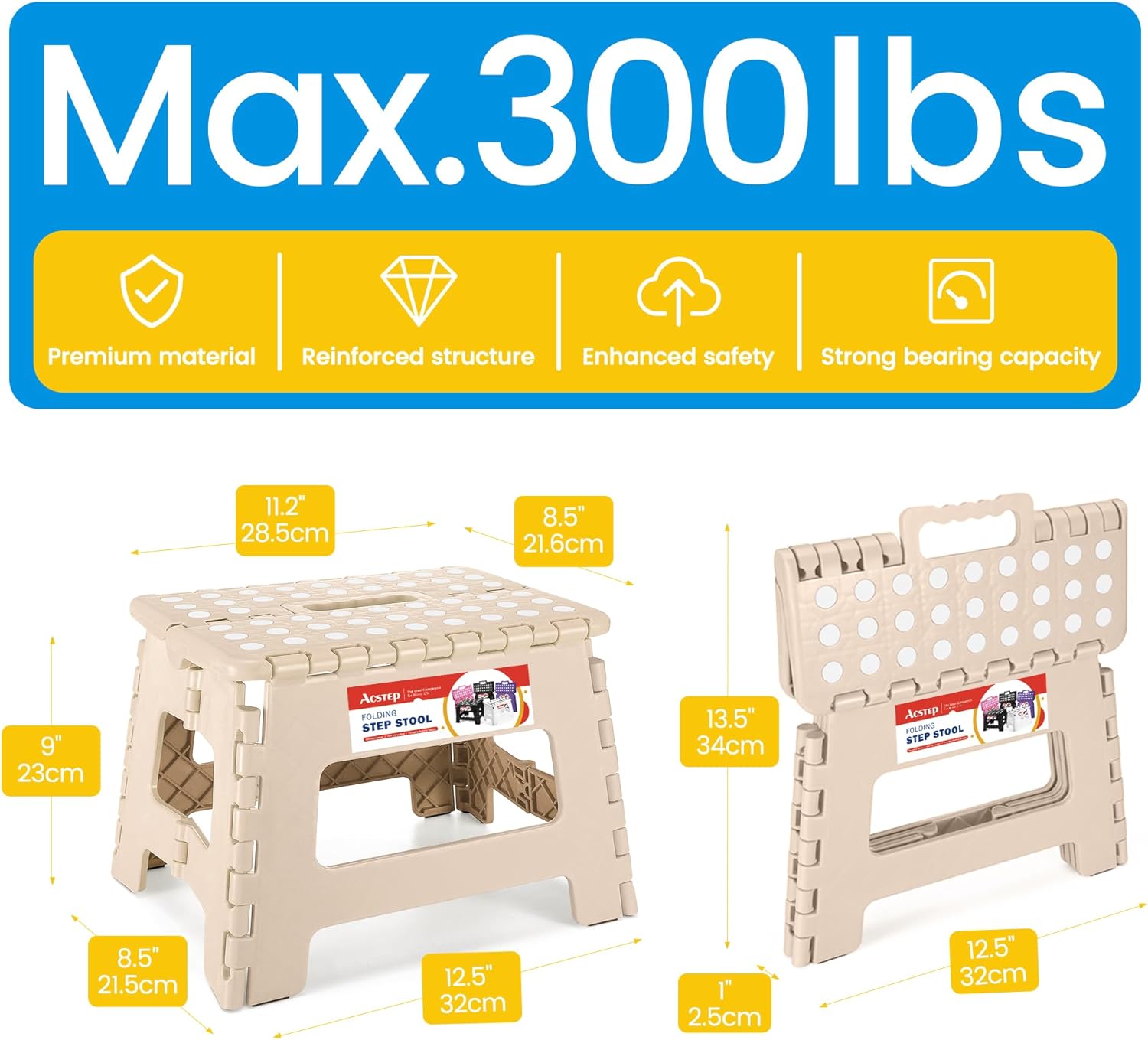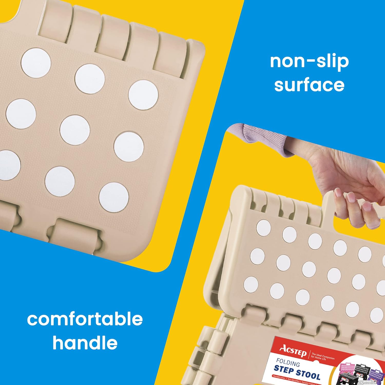 ACSTEP Folding Step Stool - 9 Inch Lightweight Plastic Non-Slip Foldable Stool for Kitchen, Bathroom, Bedroom - Khaki