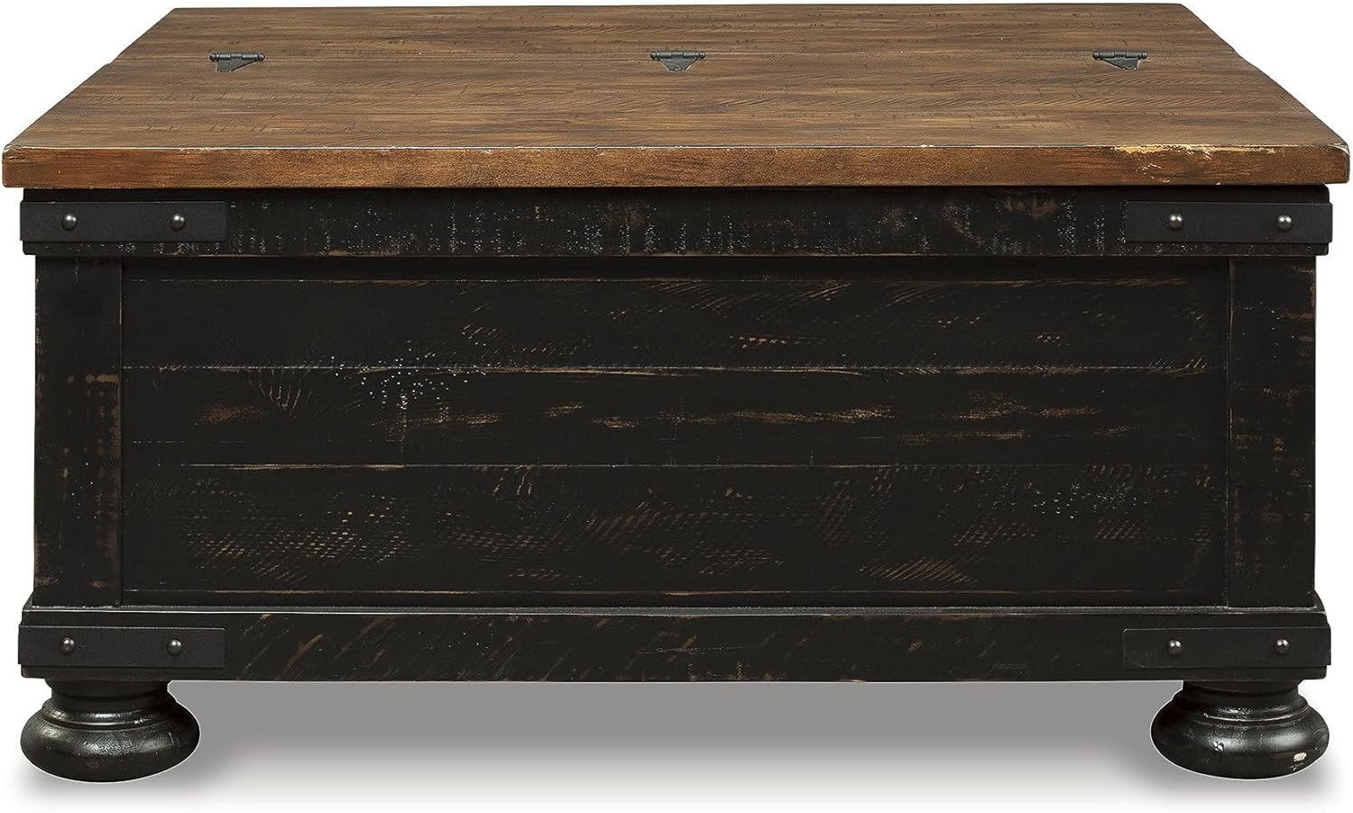 - LIFT TOP COFFEE TABLE: This rustic two-tone coffee table doubles up on form and function. Designer touches include plank effect styling, distress marks and industrial brackets for added character