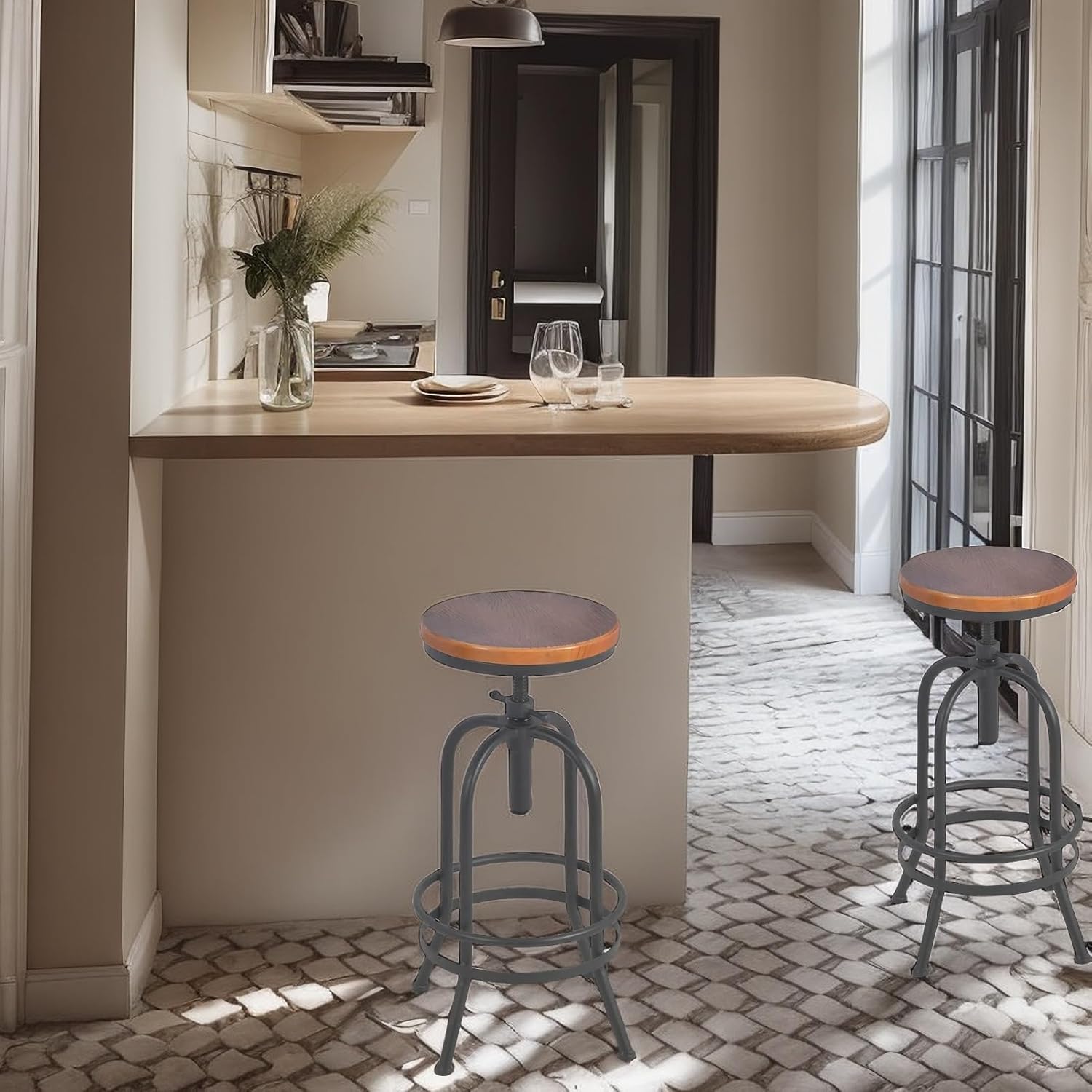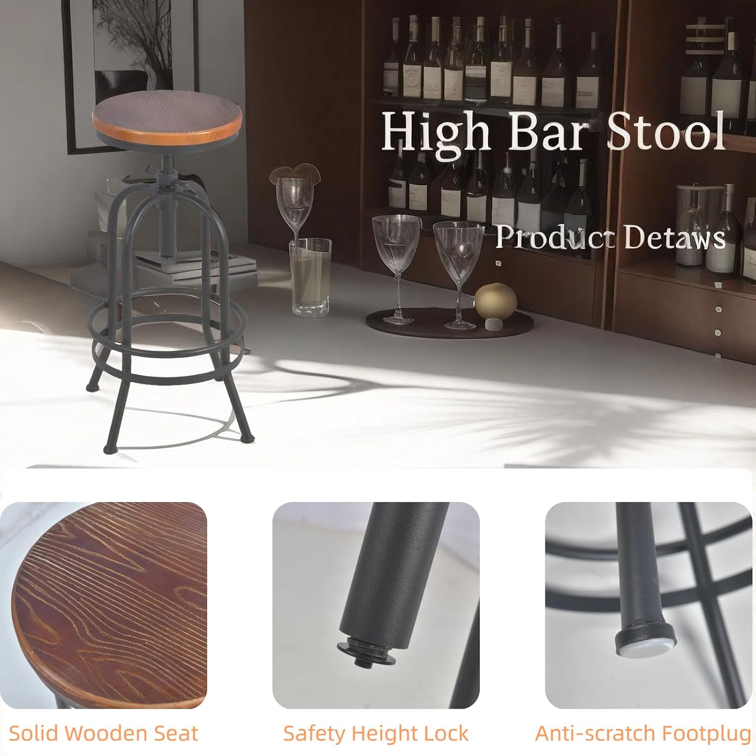 - Extra Tall Bar Height.360 degree swivel from 26” up to 32.3” to meet your needs. Easily adjust stool height just by spin the seat to meet counter height. No matter at your kitchen island, kitchen counter or pub height dining table.