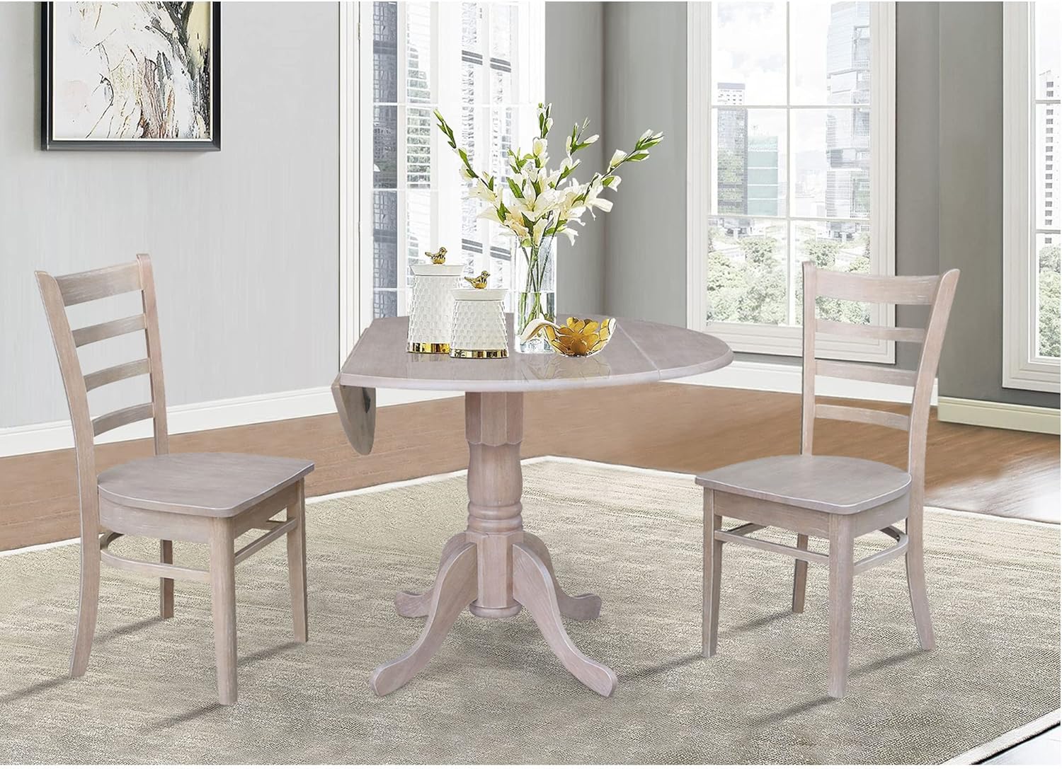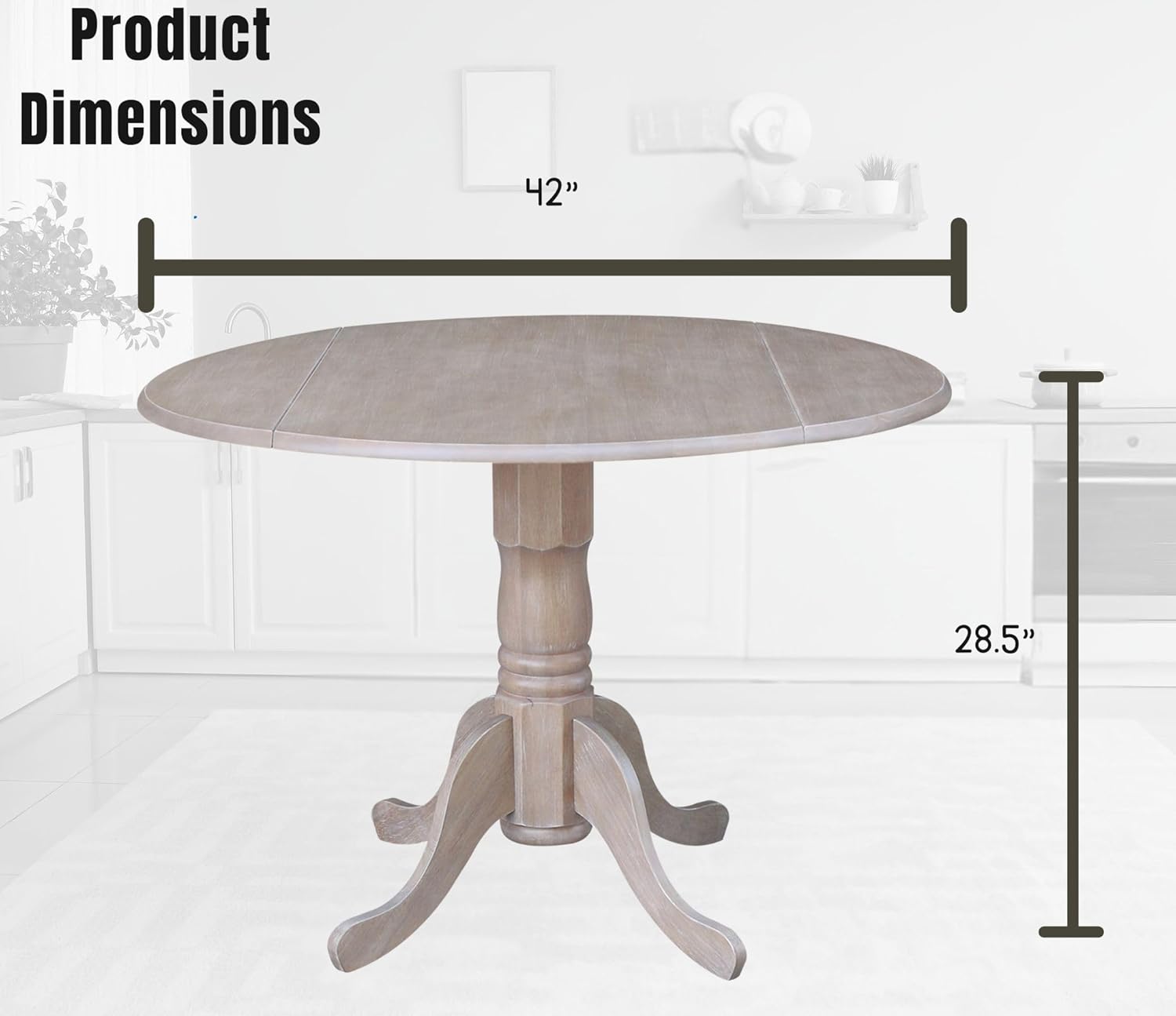IC International Concepts, 42" Round Dual Drop Leaf Pedestal Dining Table, Solid Real Wood, Sturdy Parawood, Dimensions 42"D x 42"W x 29.5"H, 20mm thickness, 40lbs Weight Capacity, Washed Gray Taupe