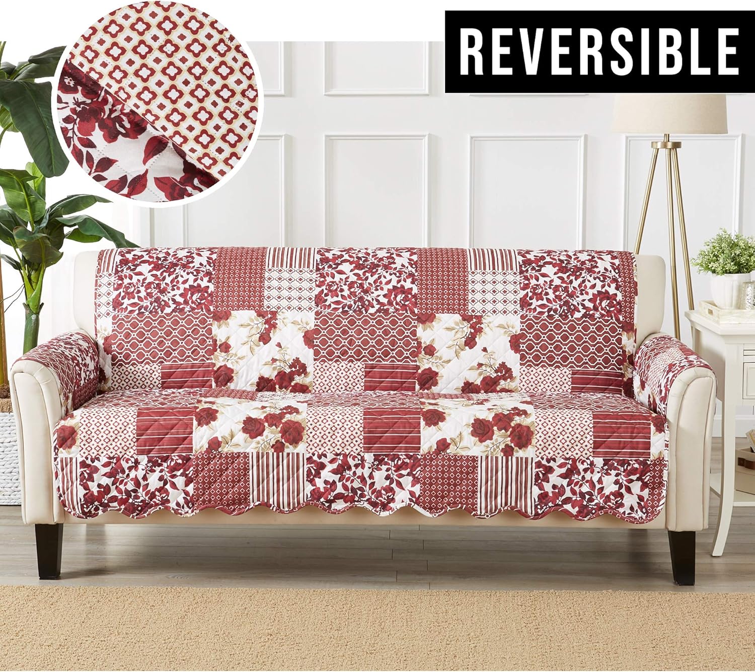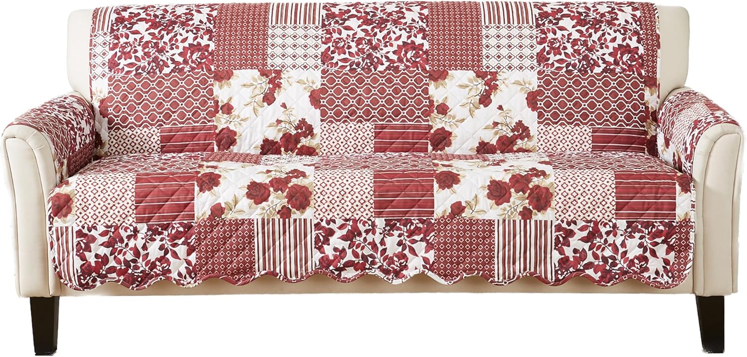 Great Bay Home Patchwork Scalloped Printed Furniture Protector Stain Resistant Sofa Cover (Sofa, Burgundy)
