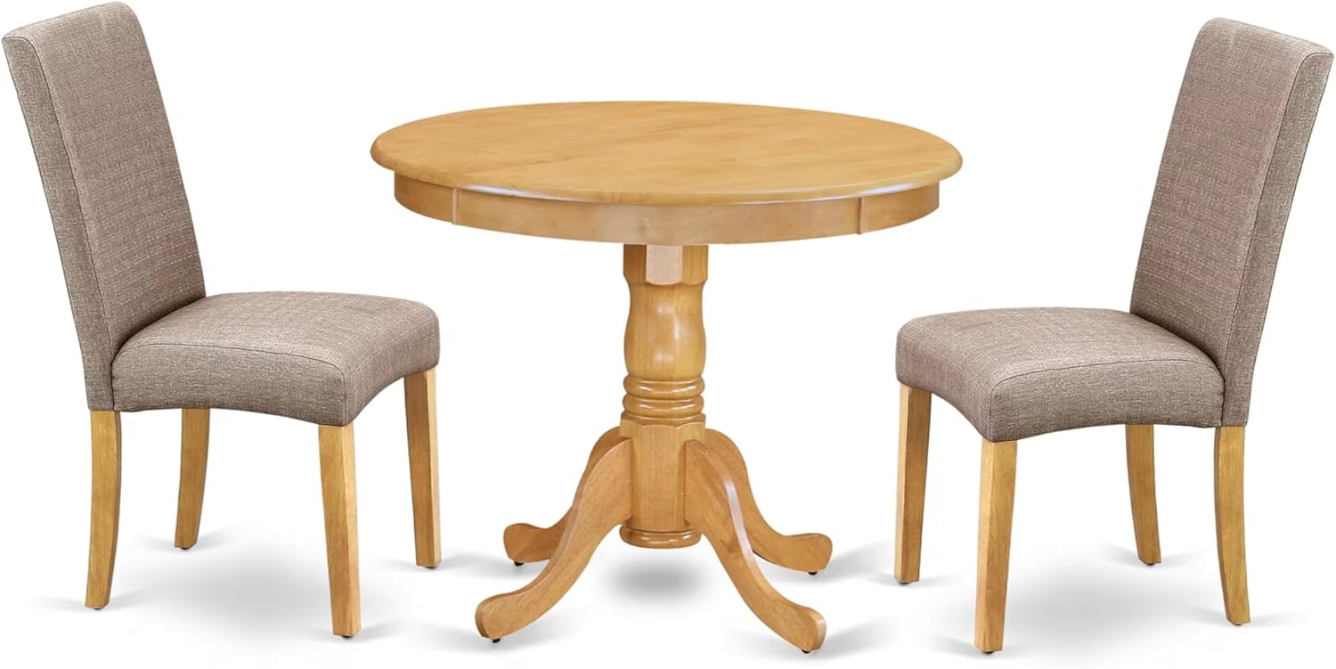 East West Furniture ANDR3-OAK-16 3 Piece Dining Table Set Contains a Round Kitchen Table with Pedestal and 2 Dark Khaki Linen Fabric Upholstered Kitchen Chairs, 36x36 Inch, Oak