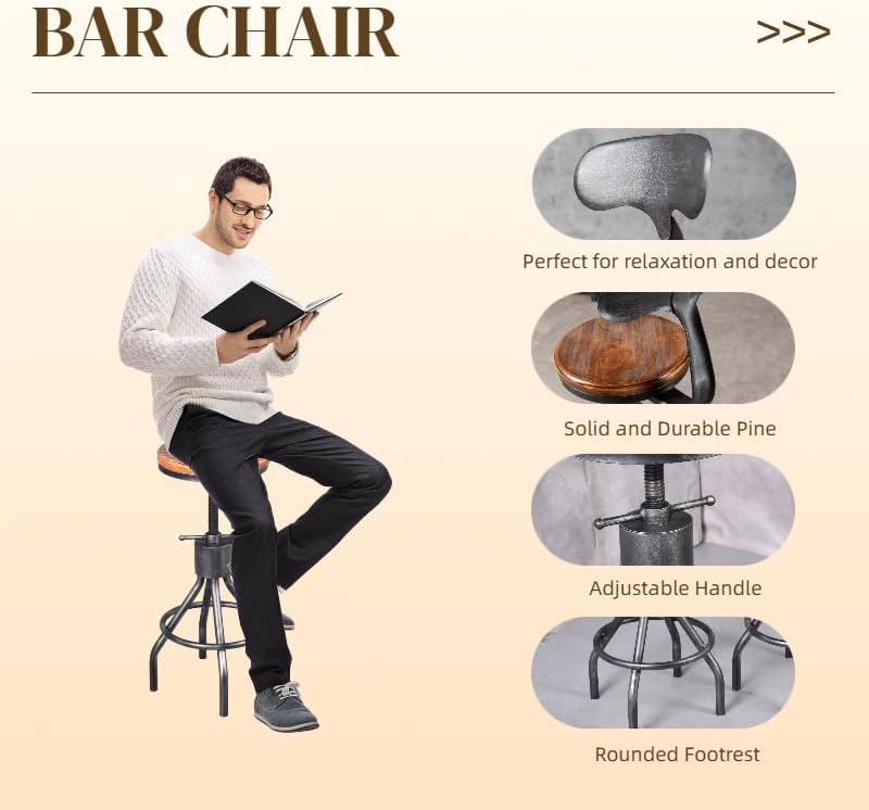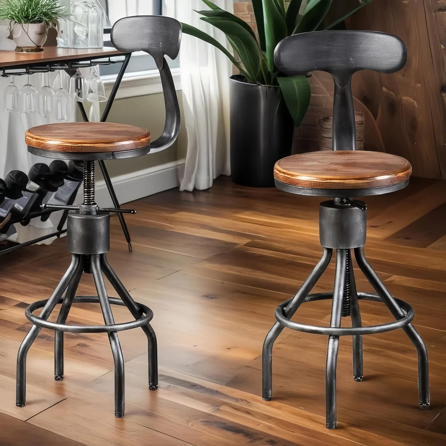 LOKKHAN Set of 2 Rustic Industrial Bar Stool-24-30 Adjustable Metal Swivel Wooden Top Barstools-Counter Height Extra Tall Bar Height-Vintage Farmhouse Kitchen Breakfast Cafe Stool-with Backrest