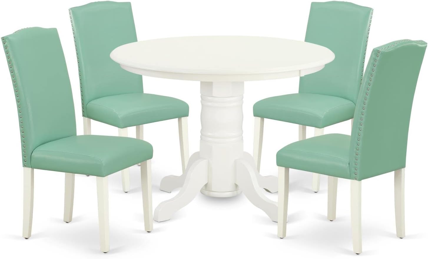 East West Furniture SHEN5-LWH-57 5 Piece Dining Set Includes a Round Dining Room Table with Pedestal and 4 Pond Faux Leather Upholstered Parson Chairs, 42x42 Inch, Linen White