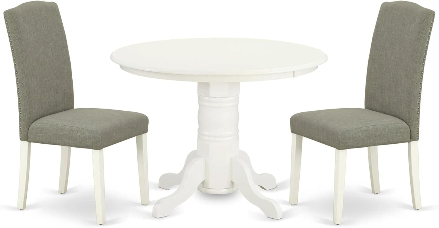 East West Furniture SHEN3-LWH-06 3 Piece Dining Set Contains a Round Kitchen Table with Pedestal and 2 Dark Shitake Linen Fabric Parson Dining Chairs, 42x42 Inch, Linen White