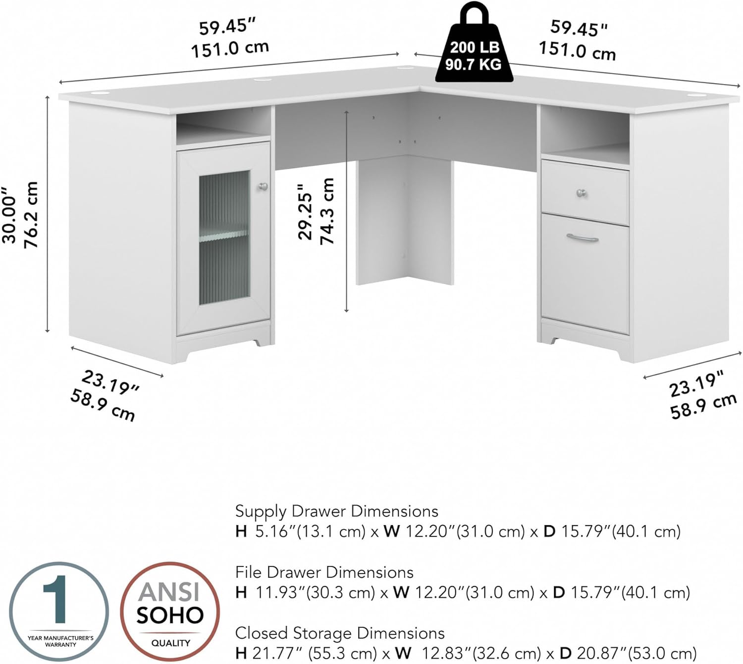 Bush Furniture Cabot L Shaped Computer Desk in White | Corner Table with Drawers and Storage for Personal Home Office Workspace