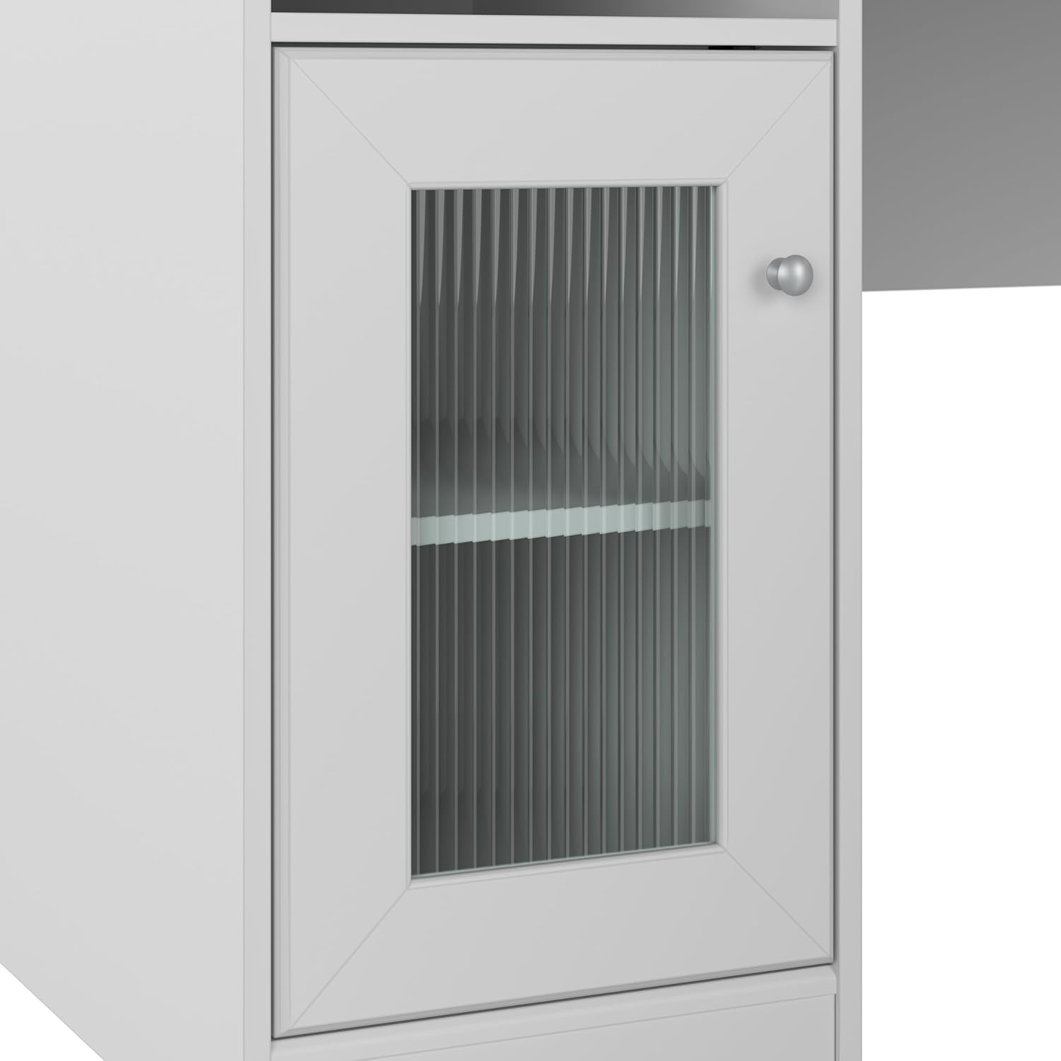 - A Productivity Powerhouse - Conveniently host a large monitor, printer, and speakers on this sturdy L shaped desk with drawers. The adjustable shelf behind the fluted glass door keeps your work organized and out of sight.