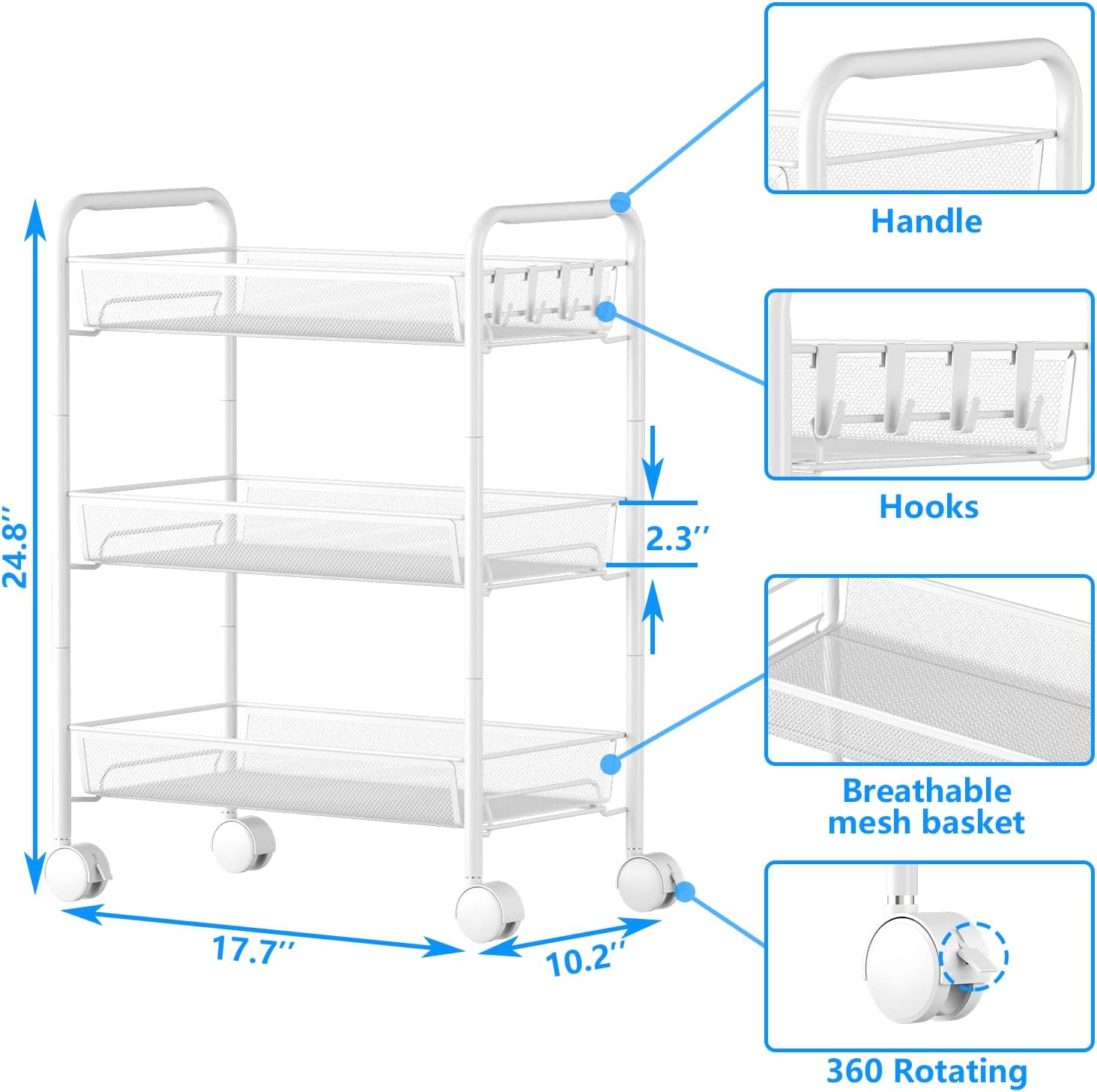OVICAR Mesh Wire 3 Tier Rolling Cart, Kitchen Storage Utility Cart, Multifunction Basket Stand for Bathroom, Full Metal Storage Art Trolley Carts with Wheels & 4 Side Hooks (White)