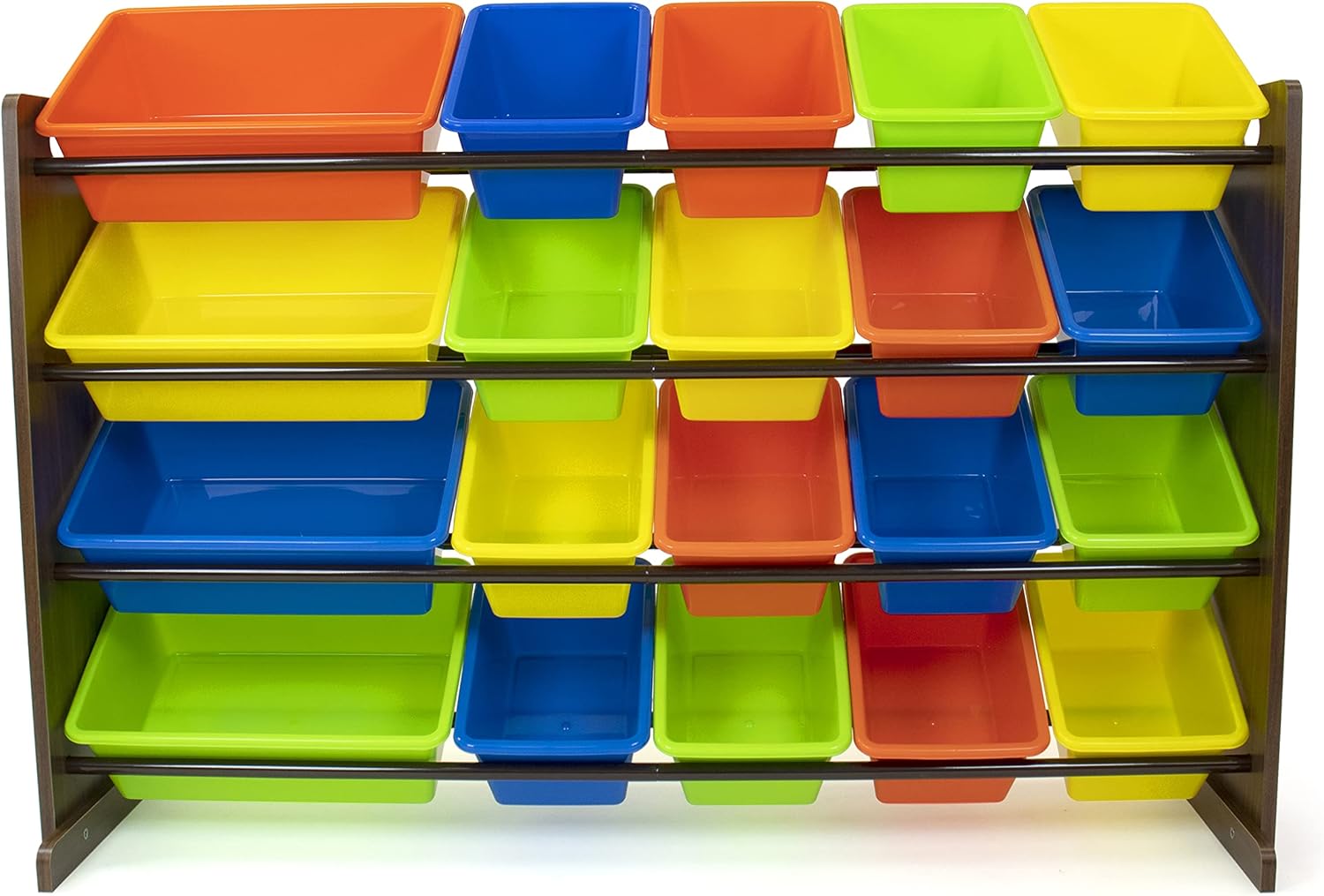 Humble Crew Extra-Large Toy Organizer with 20 Plastic Bins – Dark Walnut/Neon Storage Rack with 4-Tier Shelves, Anti-Tip Safety, for Kids’ Rooms, Playrooms, Nurseries & Classrooms
