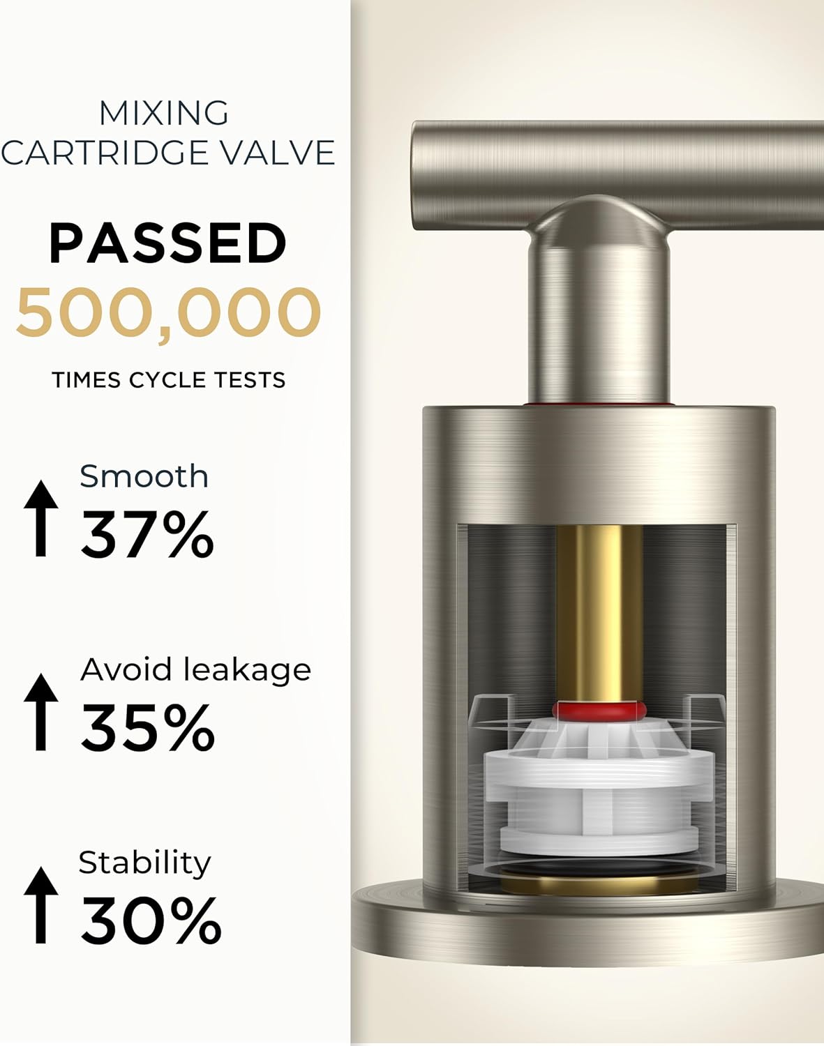 - STRONG HEART: The brush nickel bathroom faucet Drip-free copper&ceramic disc mixing cartridge has passed 500,000 cycles of water tightness test, to ensure that the bathroom faucets is stable. The Double-enhanced abrasion durability providing leak-free, trouble-free performance