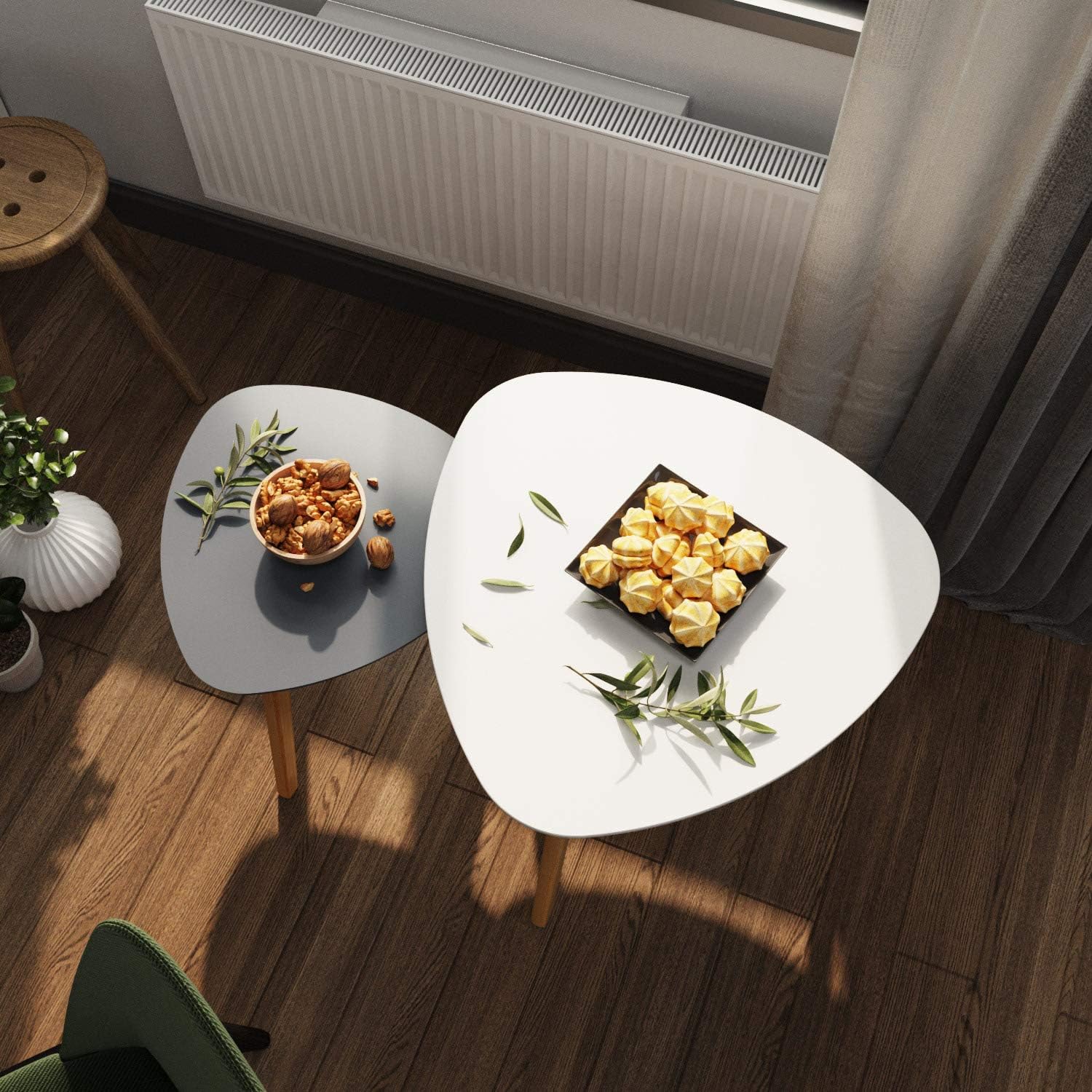 BAMEOS Bamboo Nesting Triangle End Table,Set of 2 Coffee Table Modern Minimalist Side Table for Living Room, Balcony in White & Grey