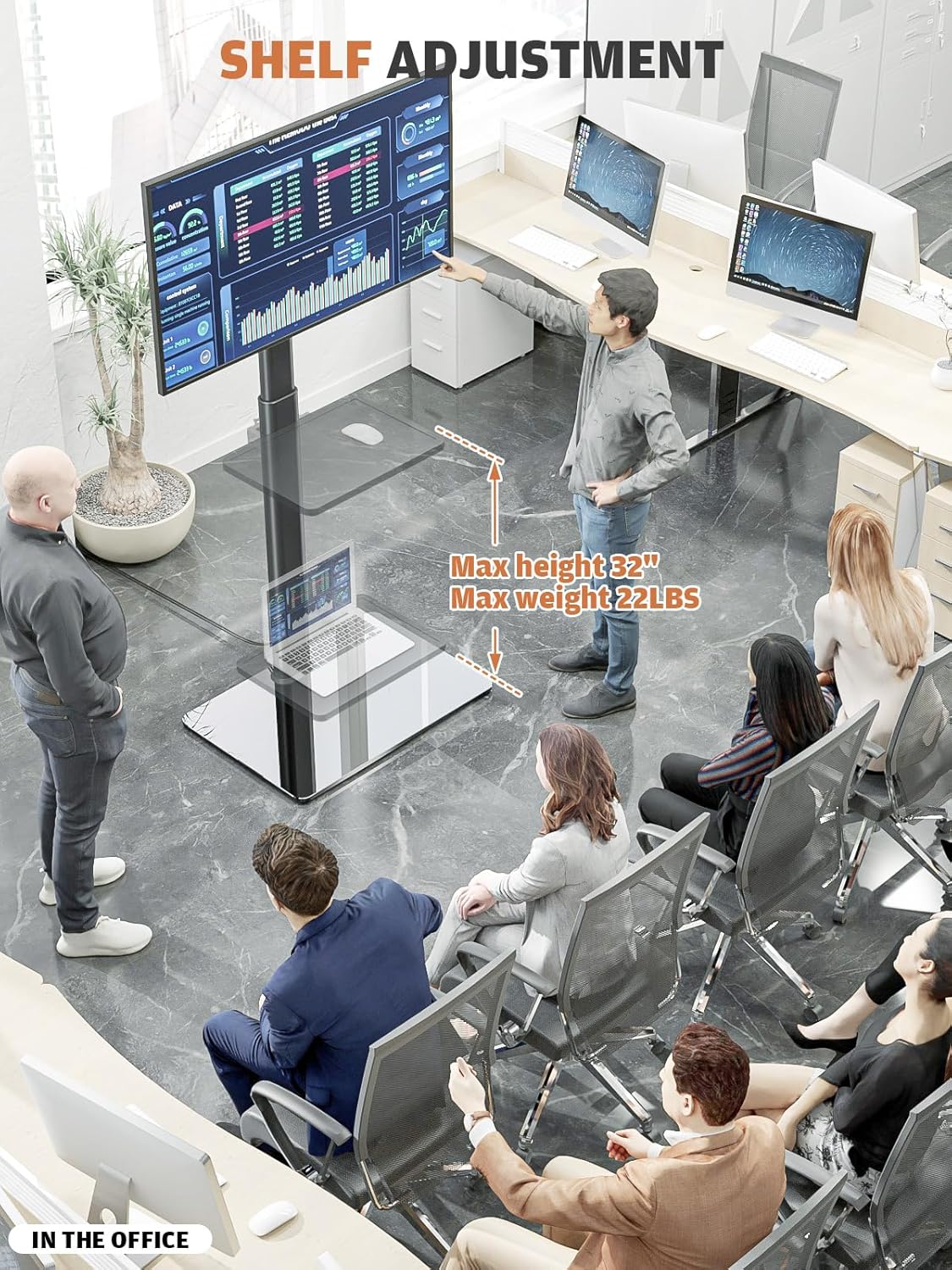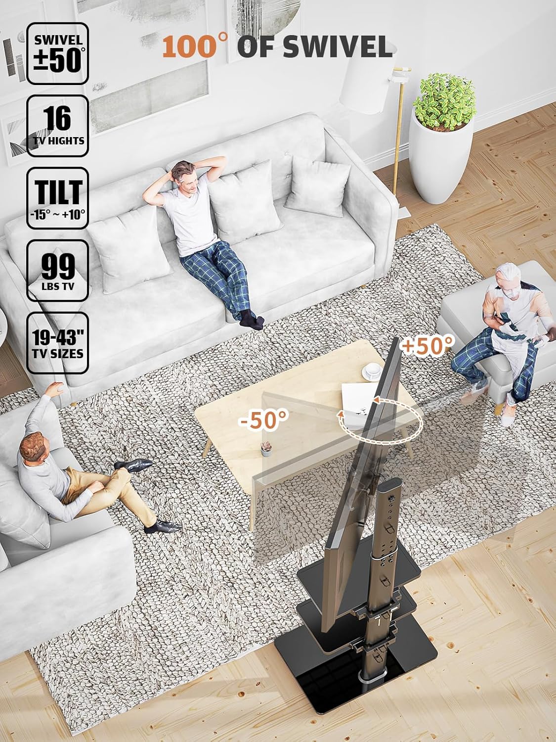 - MULTIFUNCTIONAL FLOOR TV STAND ☞ My functional TV mount have 8 level height adjustment in order to choose your best space, besides -50 to +50 degree swivel mount can choose the best viewing to catch TV entertainment, Tilt function can expand the viewing angle in order to enjoy your view effection