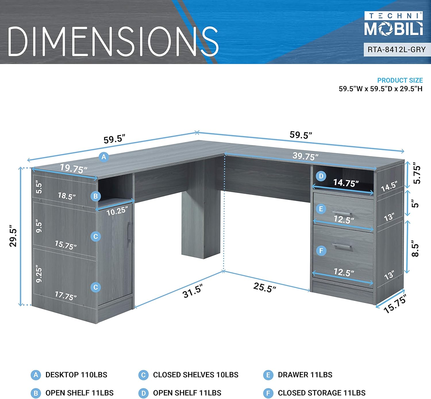 Techni Mobili Functional L-Shaped Computer Desk with storage, L is 59.5" wide x 59.5" Long, Grey