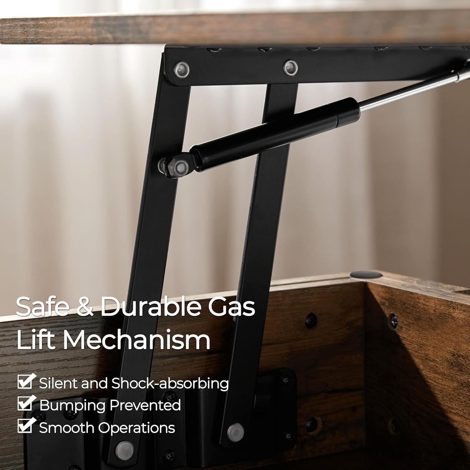 - Lift-top Design: The tabletop of this coffee table can be effortlessly elevated to a comfortable height to create a spacious workspace or dining surface while you’re sitting on the sofa. The heavy-duty metal mechanism allows smooth and easy operation