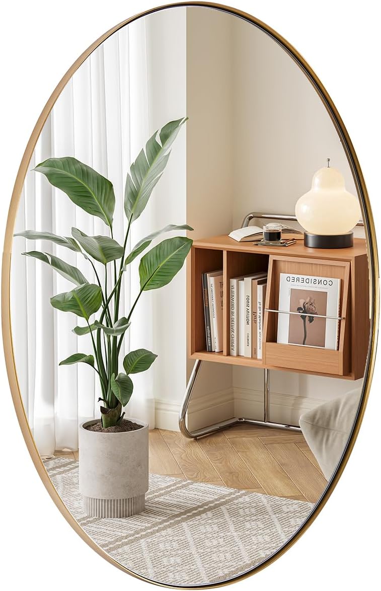 - Beautiful in Design: A slim, modern-inspired stainless steel frame embraces the oval mirror; its trendy brushed gold finish adds style; display it in your bathroom; effortlessly decorate your walls while bringing light and space into the room