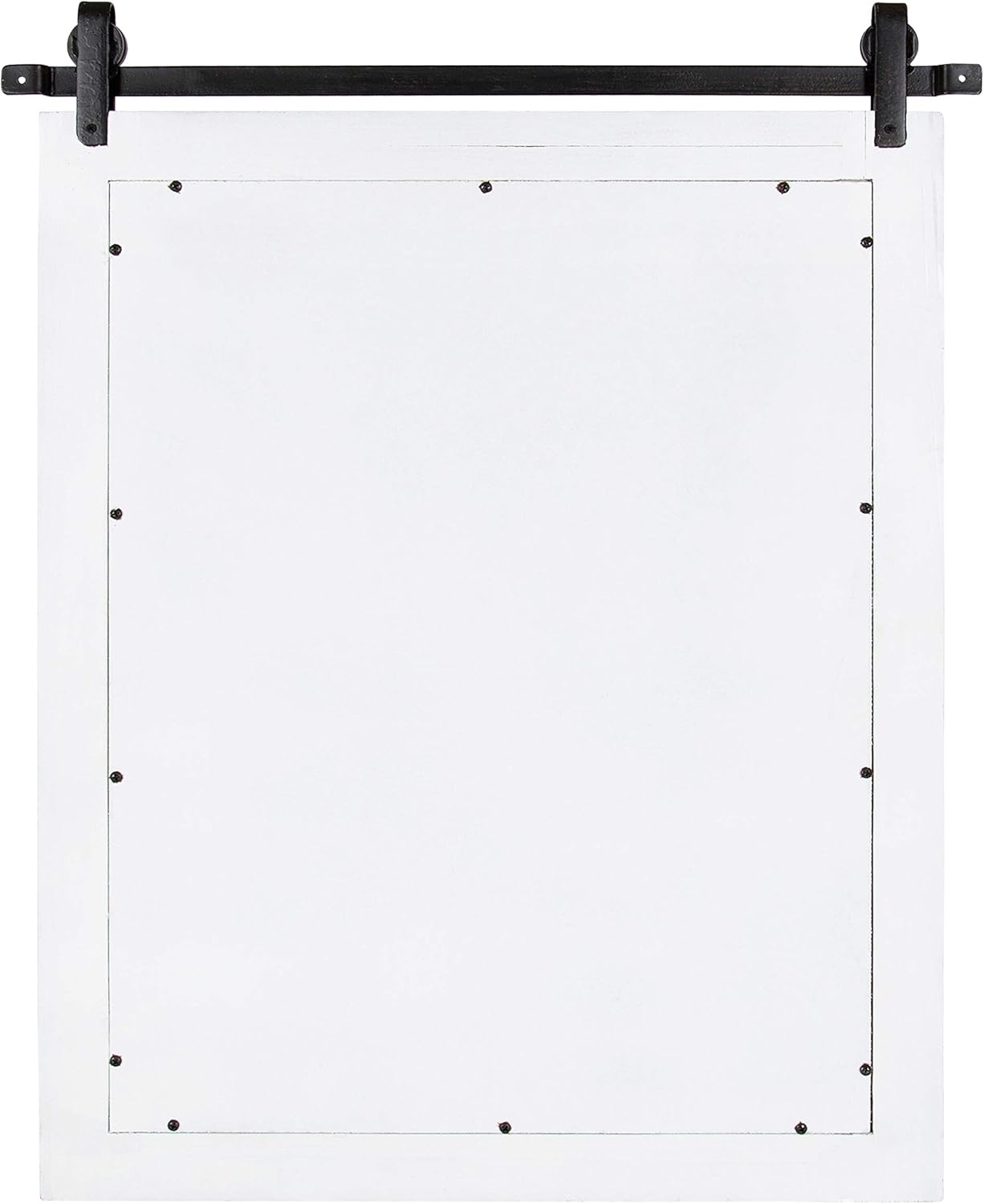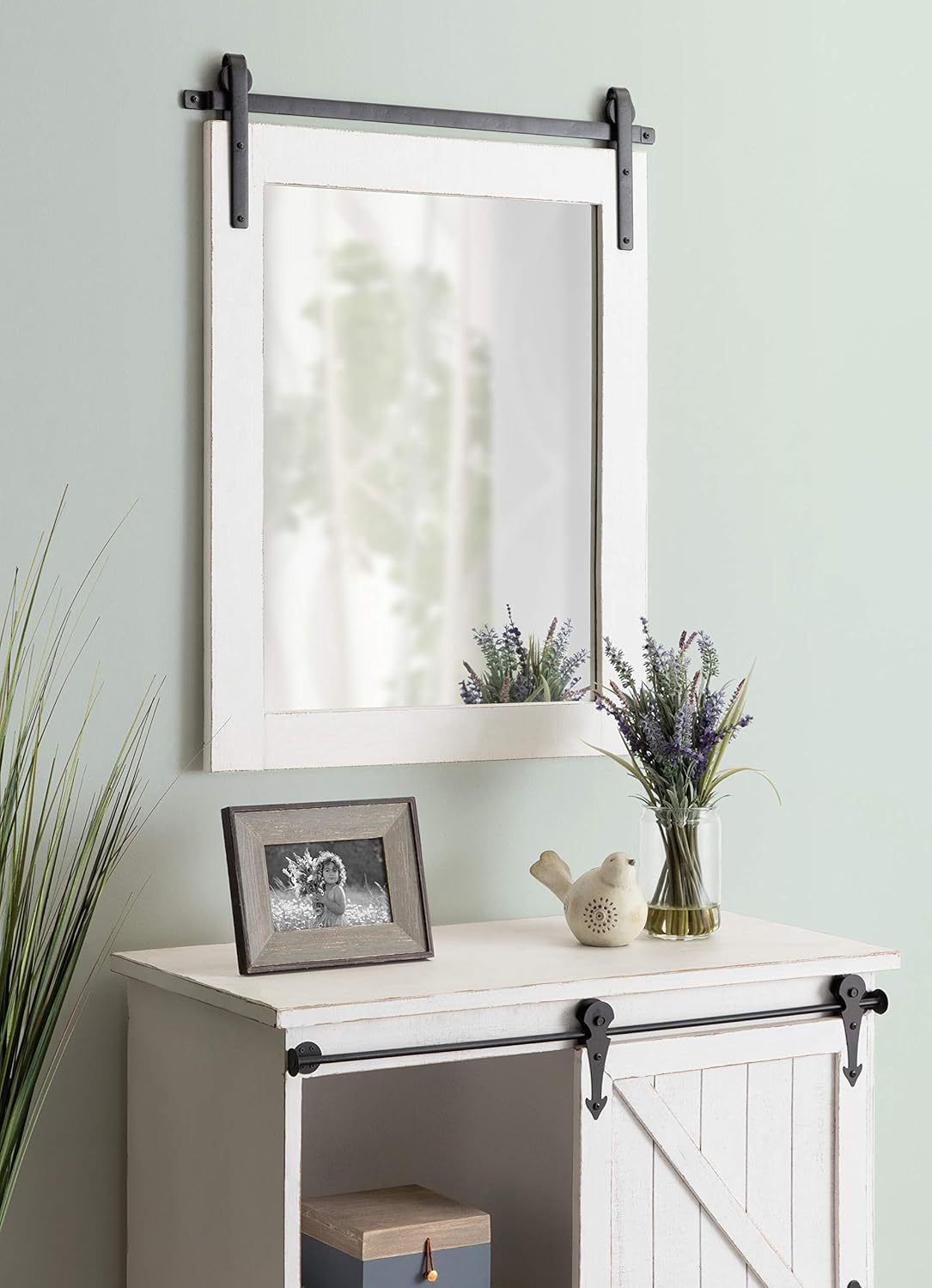 - RUSTIC FARMHOUSE MIRROR: The Cates mirror features a barn door-inspired design with a coastal white finish and black iron bracket inspired by sliding barn doors