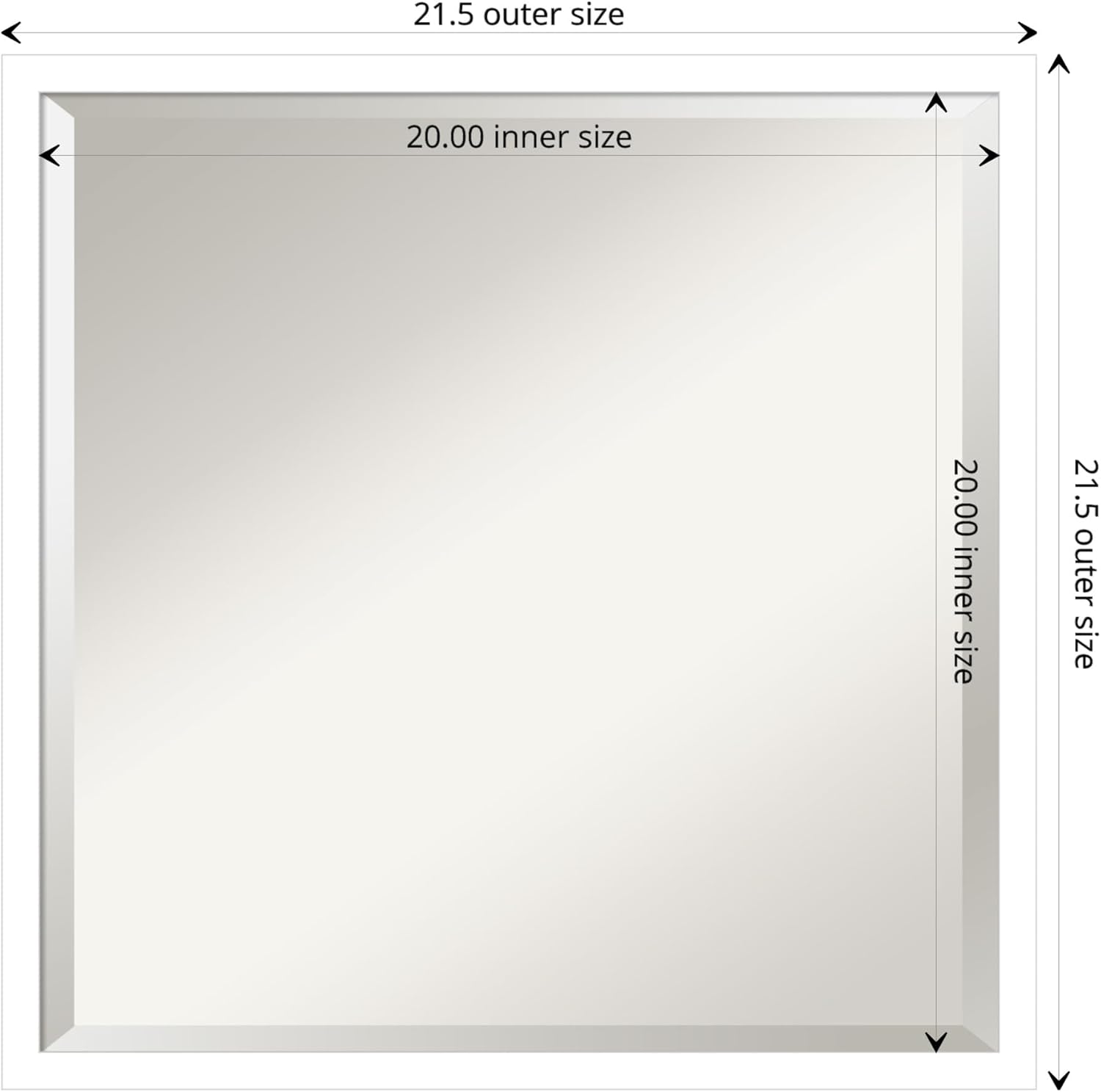 - MIRROR DETAILS: This mirror features premium glass for a clear, undistorted image and is finished with a beveled edge to give the glass a decorative touch. The overall size of this bathroom mirror measures exactly 21.5 x 21.5 inches, including the frame. Its reflective area measures 20 x 20 inches.