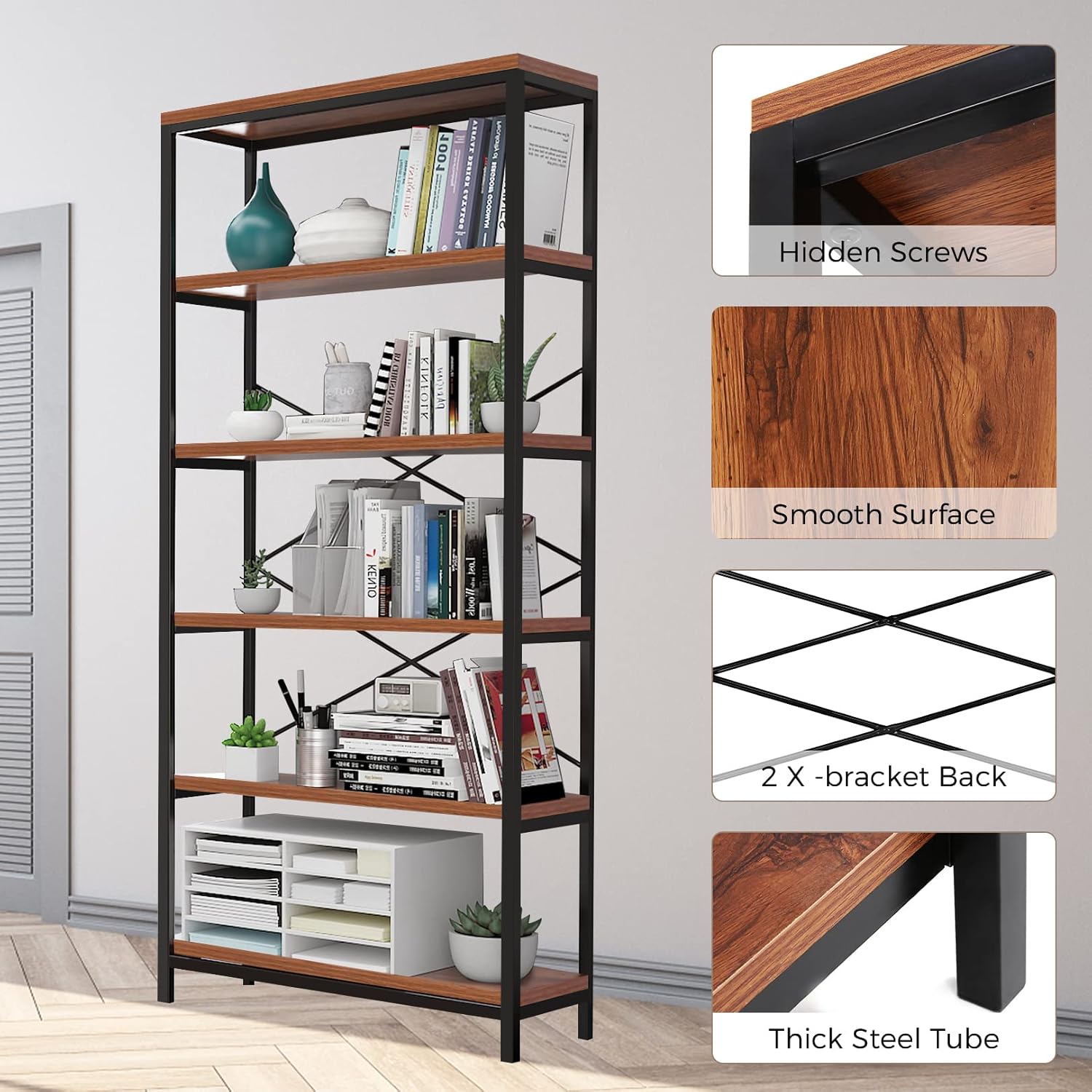 Himimi 6 Tier Industrial Bookshelf, Vintage Standing Storage Shelf, Display Shelving Units, Tall Bookcase, Industrial Metal Book Shelves for Living Room Bedroom and Home Office