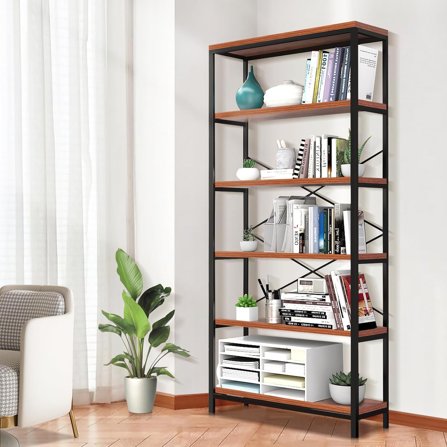 - Elegant & Open design – With burnished rustic brown MDF borad and black metal style finish, the 5 tier Industrial bookshelf looks graceful and luxurious and adds a refined touch to any space. Open shelves design with clean line structure maximize the open space feel. The 5 tier Industrial bookshelf combines art elements with utility function, make it a perfect decoration and storage space for your space. Rustic style makes it suitable for all your other furniture.