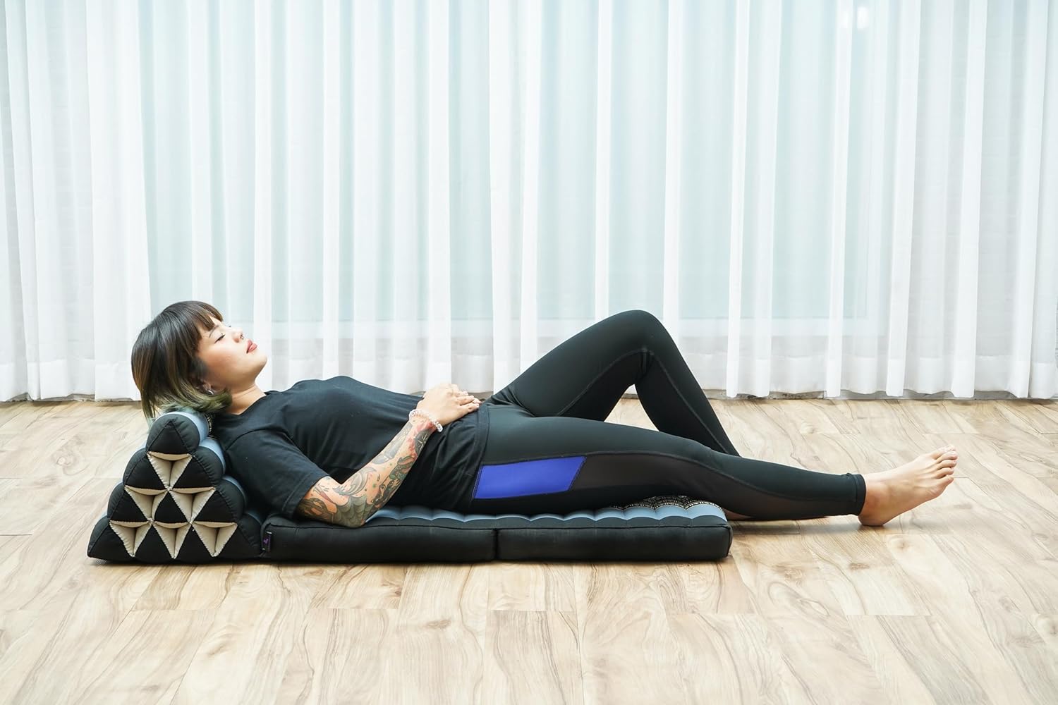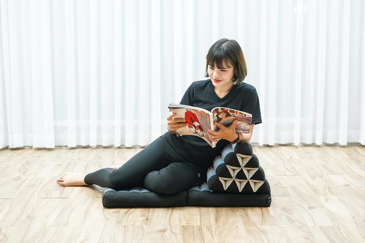 - Material: The Thai triangle pillow and the floor mat for adults is filled with natural kapok. The breathable fiber used for the floor cushions allow for a pleasant and comfortable seating position