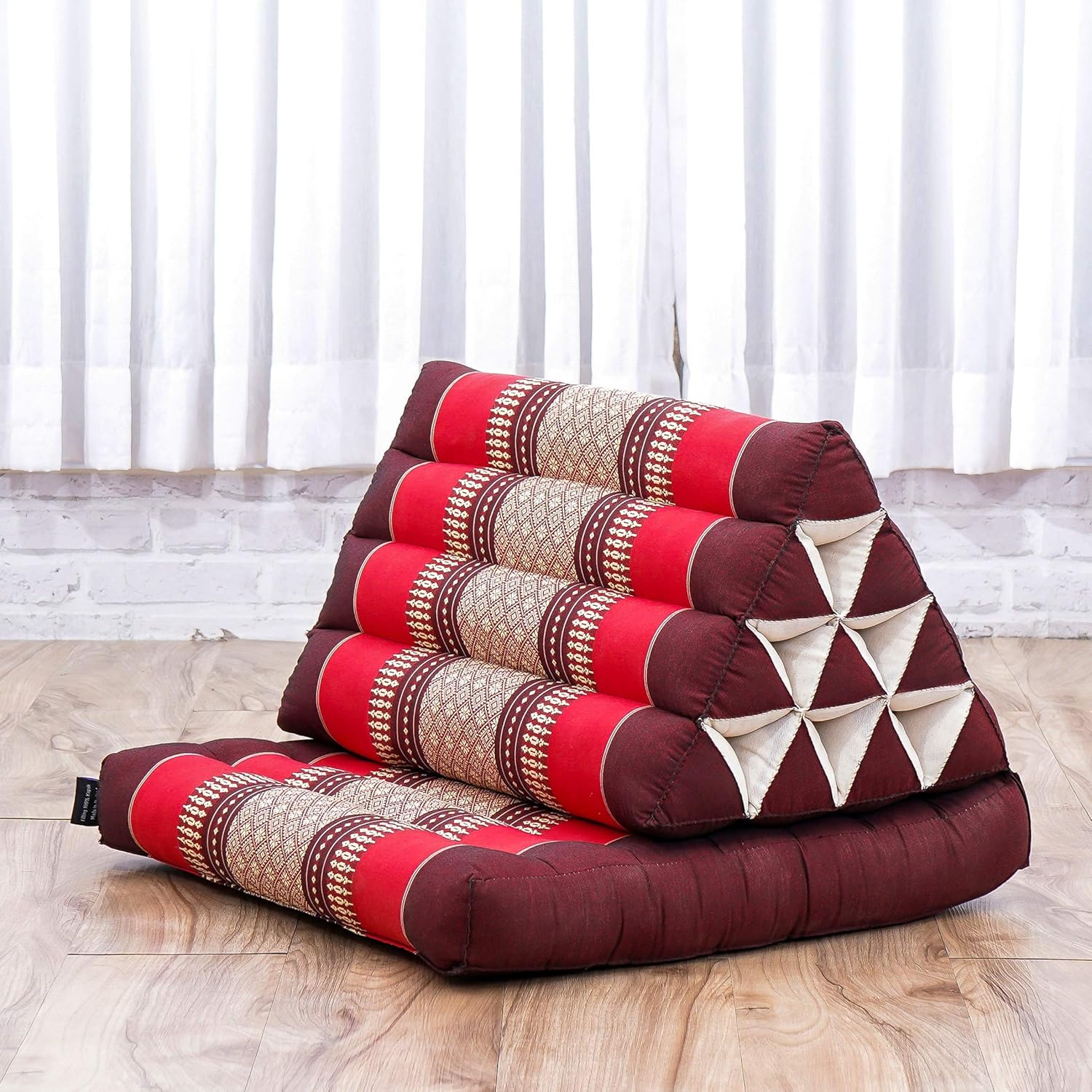- Material: The Thai triangle pillow and the floor mat for adults is filled with natural kapok. The breathable fiber used for the floor cushions allow for a pleasant and comfortable seating position