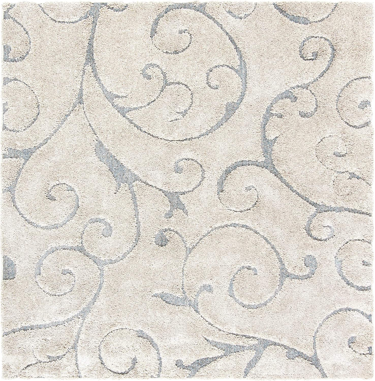 SAFAVIEH Florida Shag Collection Area Rug - 5' Square, Beige & Blue Grey, Scroll Design, Non-Shedding & Easy Care, 1.2-inch Thick Ideal for High Traffic Areas in Living Room, Bedroom (SG455-1155)