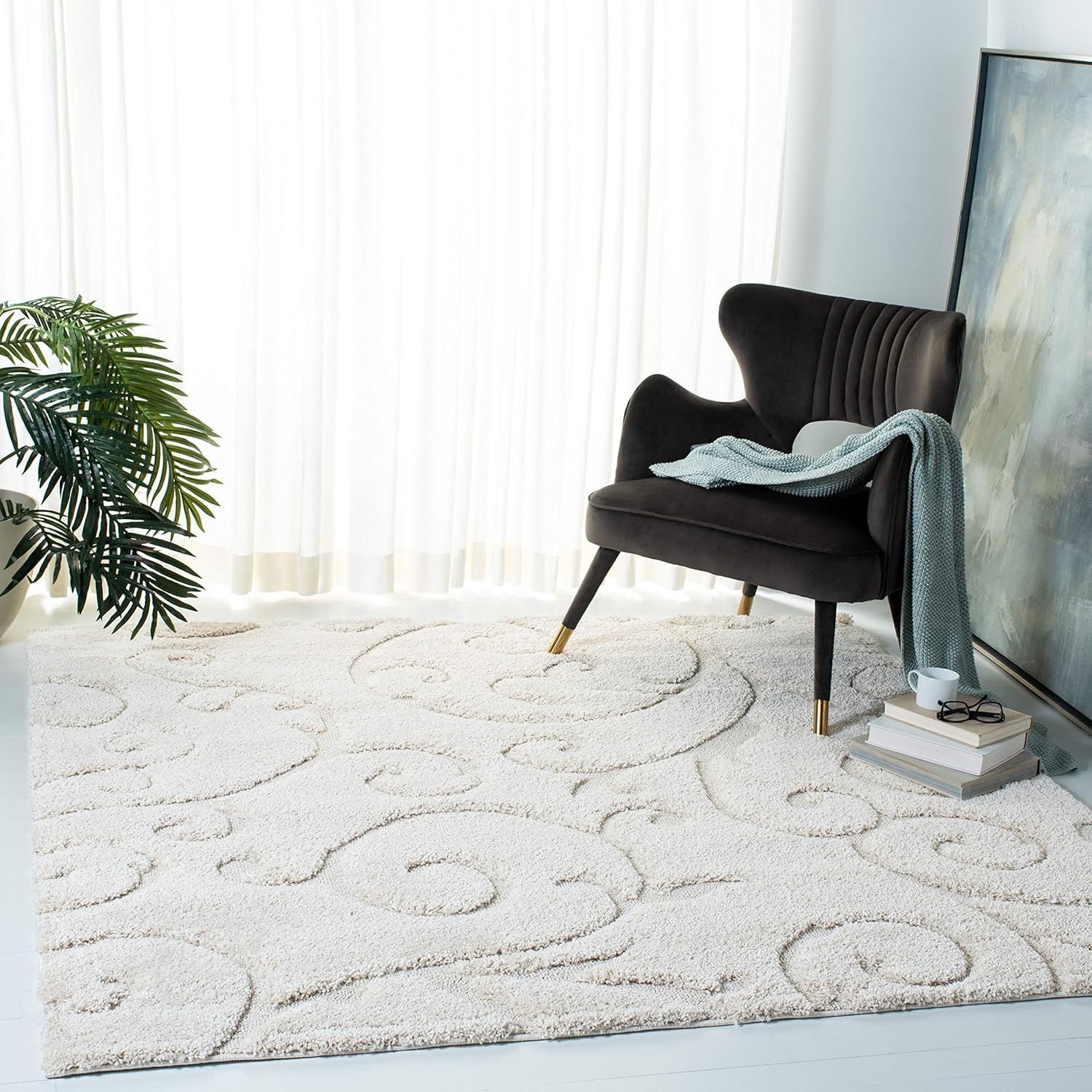 SAFAVIEH Florida Shag Collection Area Rug - 4' Square, Creme & Creme, Scroll Design, Non-Shedding & Easy Care, 1.2-inch Thick Ideal for High Traffic Areas in Living Room, Bedroom (SG455-1111)