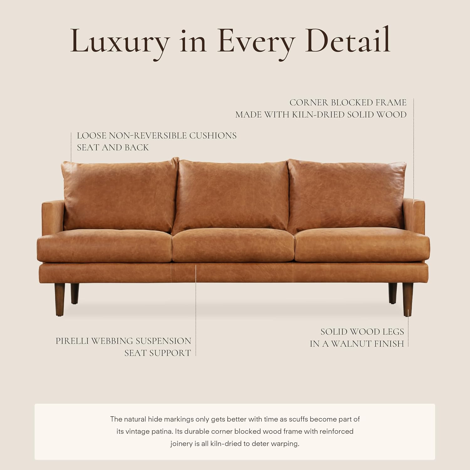 - Trend Proof Your Home: Our leather sofas made for your living room come in a timeless cognac tan color that highlights the natural beauty of the hide. Each couch leather stands out thanks to the genuine full-grain leather’s rich, natural variations in color making it a modern day classic.