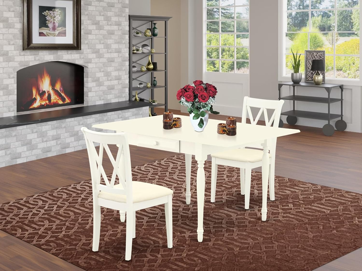 East West Furniture MZCL3-LWH-C 3 Piece Modern Dining Table Set Contains a Rectangle Wooden Table with Dropleaf and 2 Linen Fabric Kitchen Dining Chairs, 36x54 Inch, Linen White