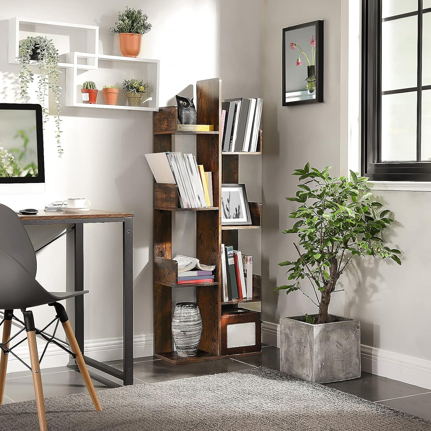 VASAGLE Bookcase, Tree-Shaped Bookshelf with 8 Storage Shelves, Rounded Corners, 19.7 x 9.8 x 55.1 Inches, Rustic Brown ULBC66BXV1