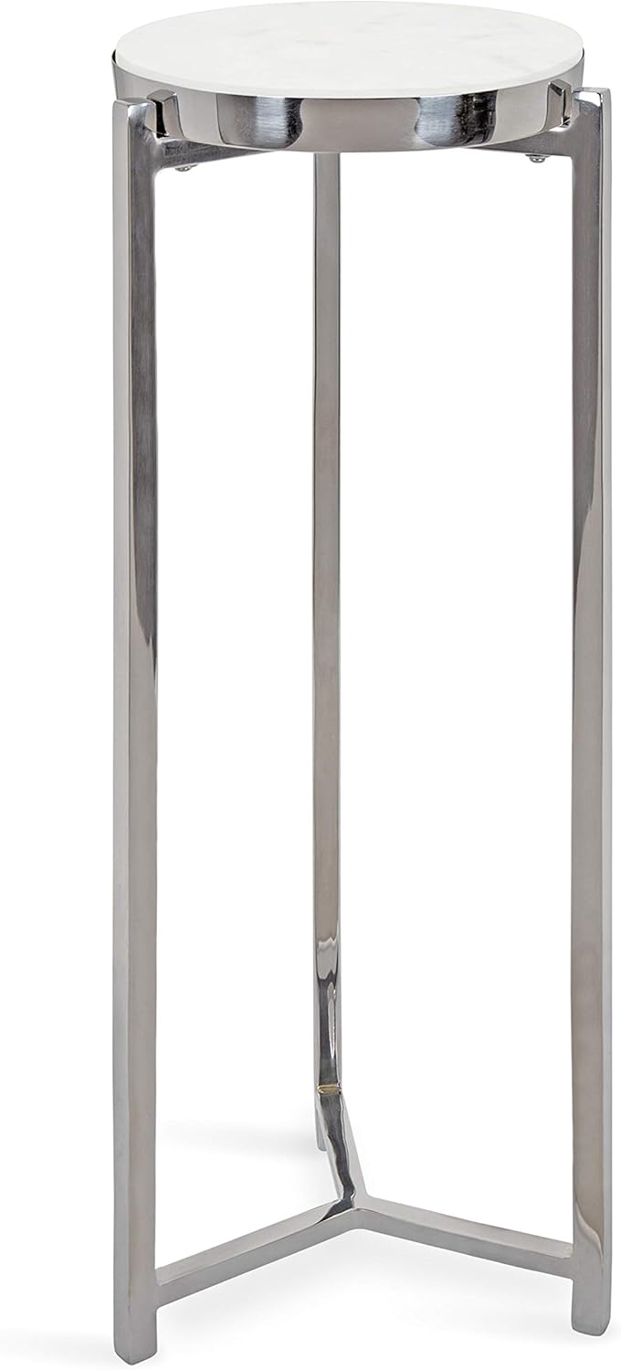 Kate and Laurel Aguilar Glam Round Drink Table, 8 x 8 x 23, Silver and White, Small Accent Table for Use as Plant Pedestal Stand with Marble Tabletop