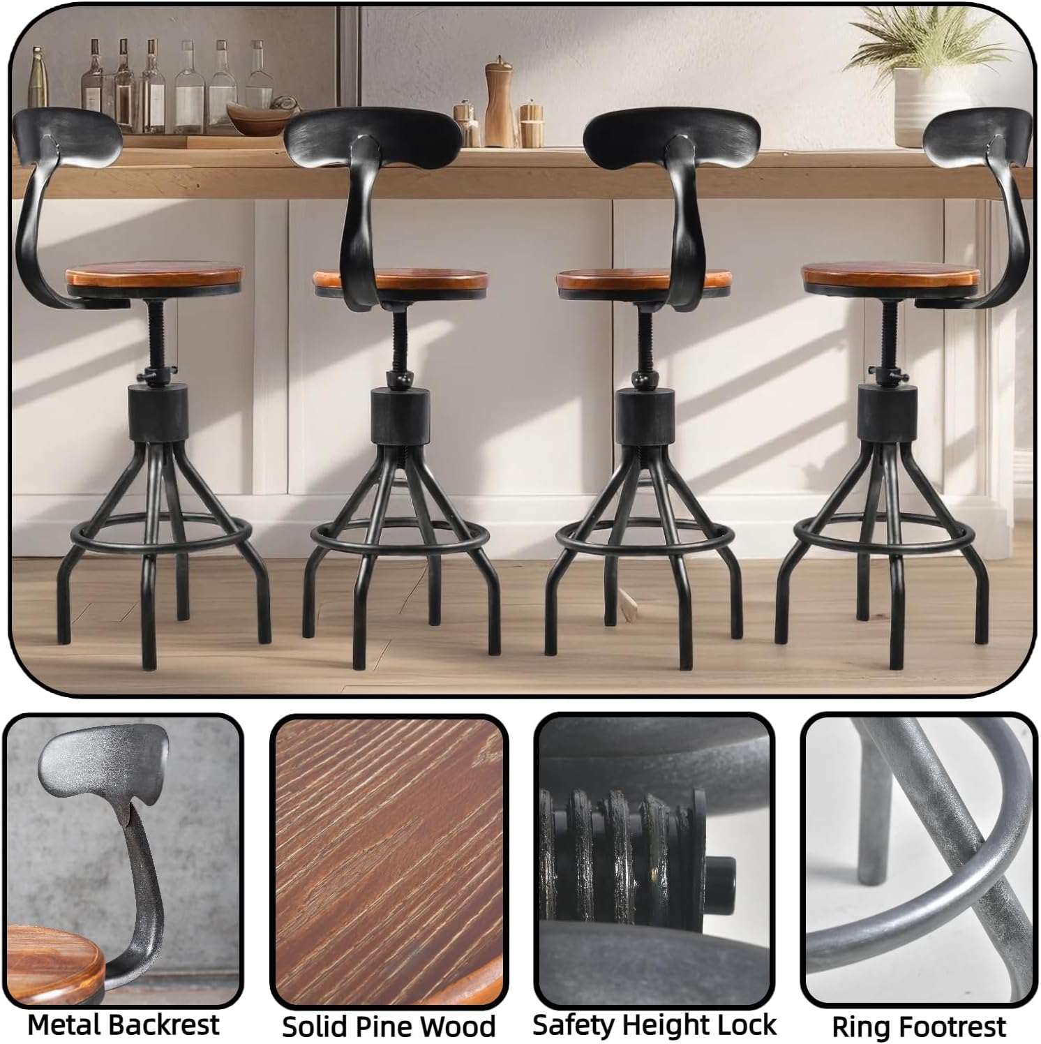 Set of 2 Vintage Bar Stool- Industrial Swivel Kitchen Dining Chair-Counter Height 23-33"-with Backrest