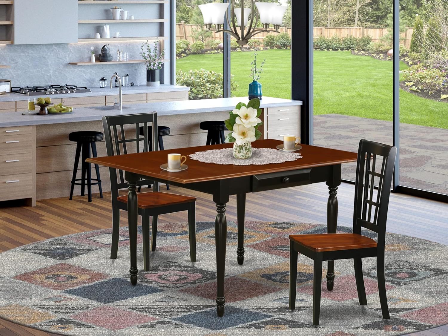 - DINING SET FINISH: This kitchen table set includes elegant dining room chairs and a stylish wooden kitchen table in a Black and Cherry finish, creating a stunning aesthetic that seamlessly integrates with any room decor. The dining table set, designed for two people, is adorned with premium paints, providing the wood with a smooth and delicate texture.