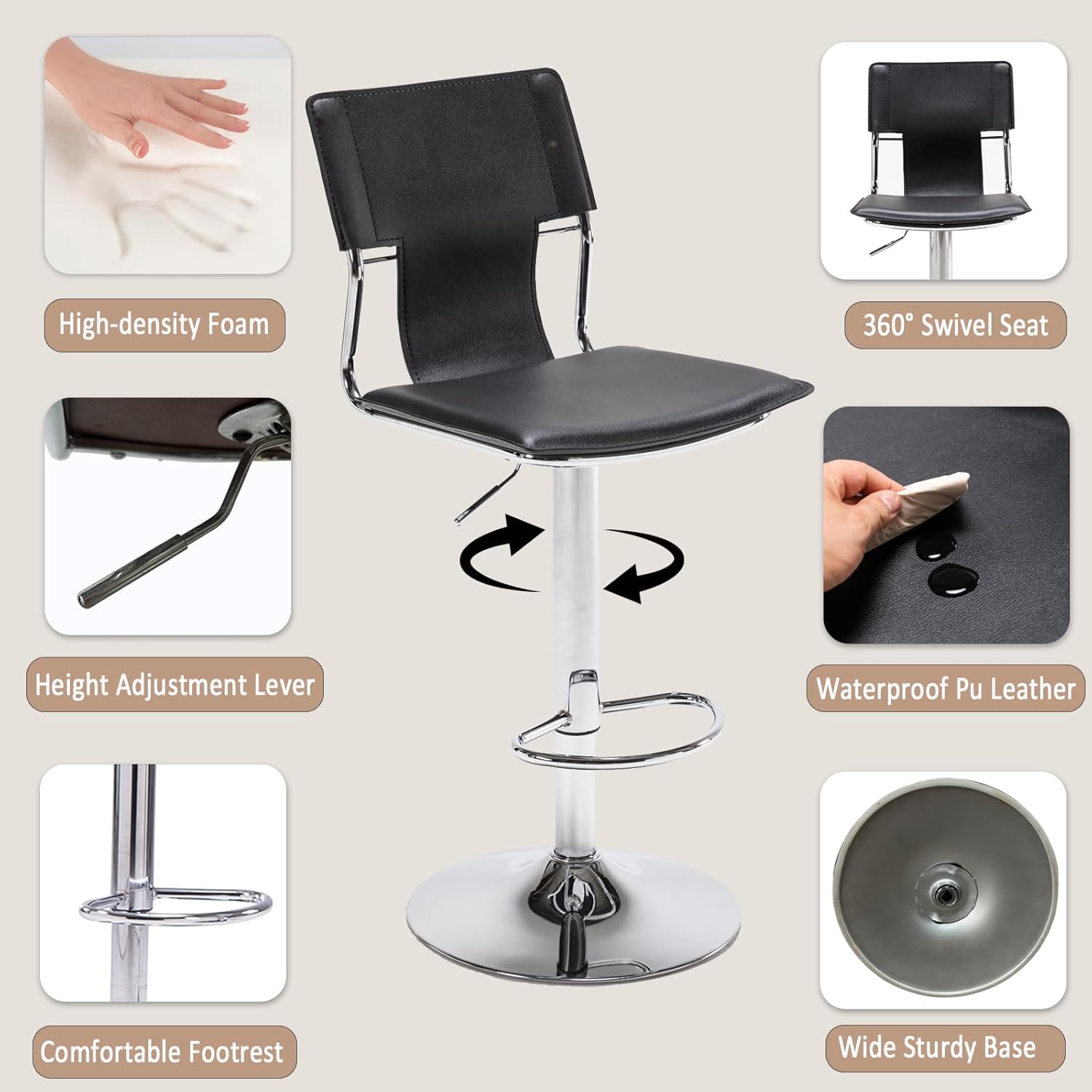 - The water-resistant surface of these leather bar stools wipes clean in seconds, perfect for busy kitchen counters. Their scratch-proof finish ensures swivel dining chairs stay looking great for years
