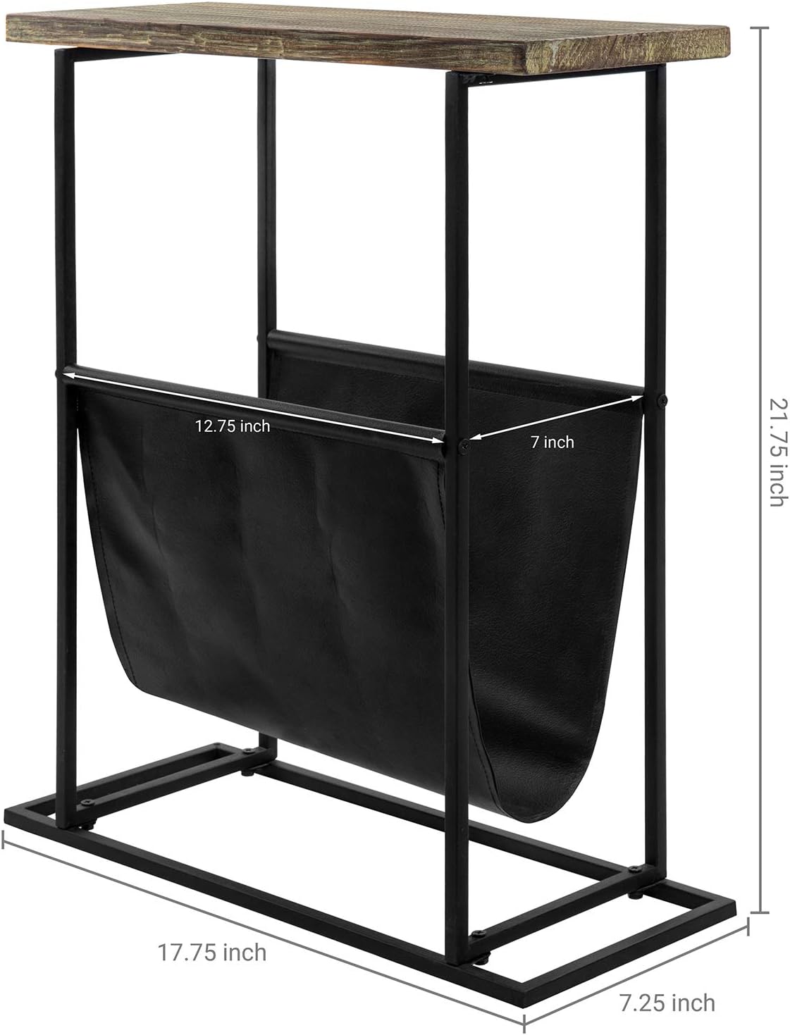 - 21 inch elegant end table with torched wood finish and leatherette magazine sling **Some assembly required**