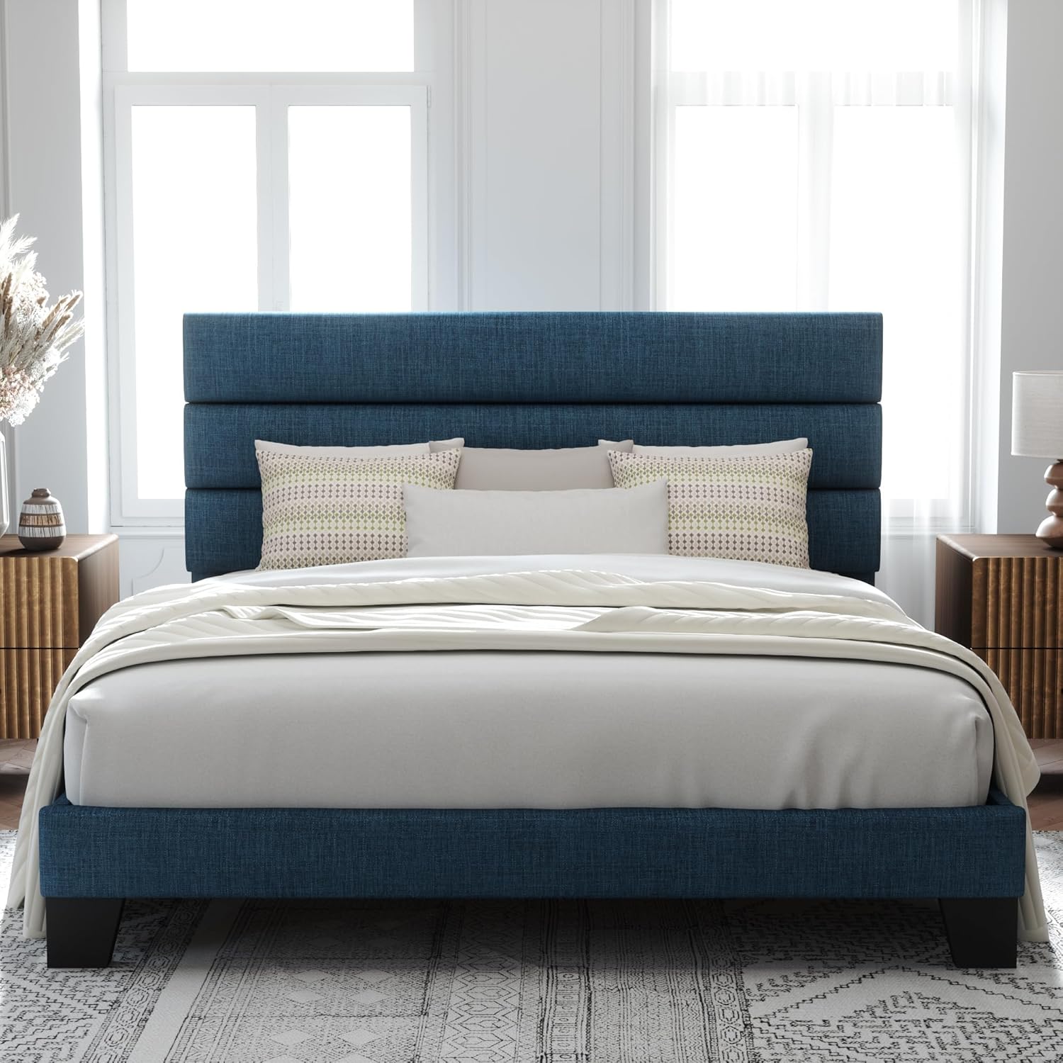 - Minimalist & Noise-Free: King size bed frame with a padded upholstered headboard, suitable for various decors; EVA mute bar prevents noise from friction, no squeaking or creaking