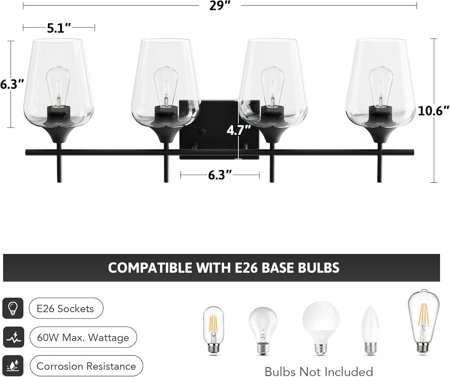 - Timeless Modern Design: This 4-light vanity light blends modern industrial style with minimalist elegance. Made with black-finish metal and clear glass shades, it adds a sleek, contemporary touch to enhance any room’s aesthetic