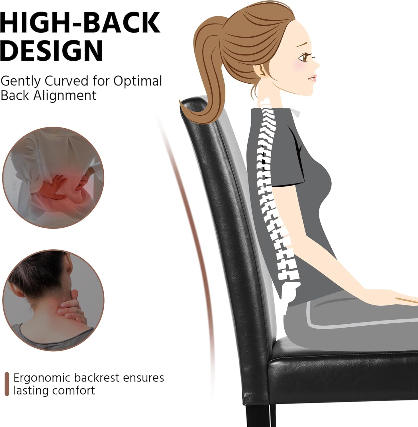 - Selected Materials: Our faux leather dining chairs are made from faux leather, solid wood, composite board, foam, and rubberwood. The foam padded seat and high-backed backrest provide you with much comfort and ease