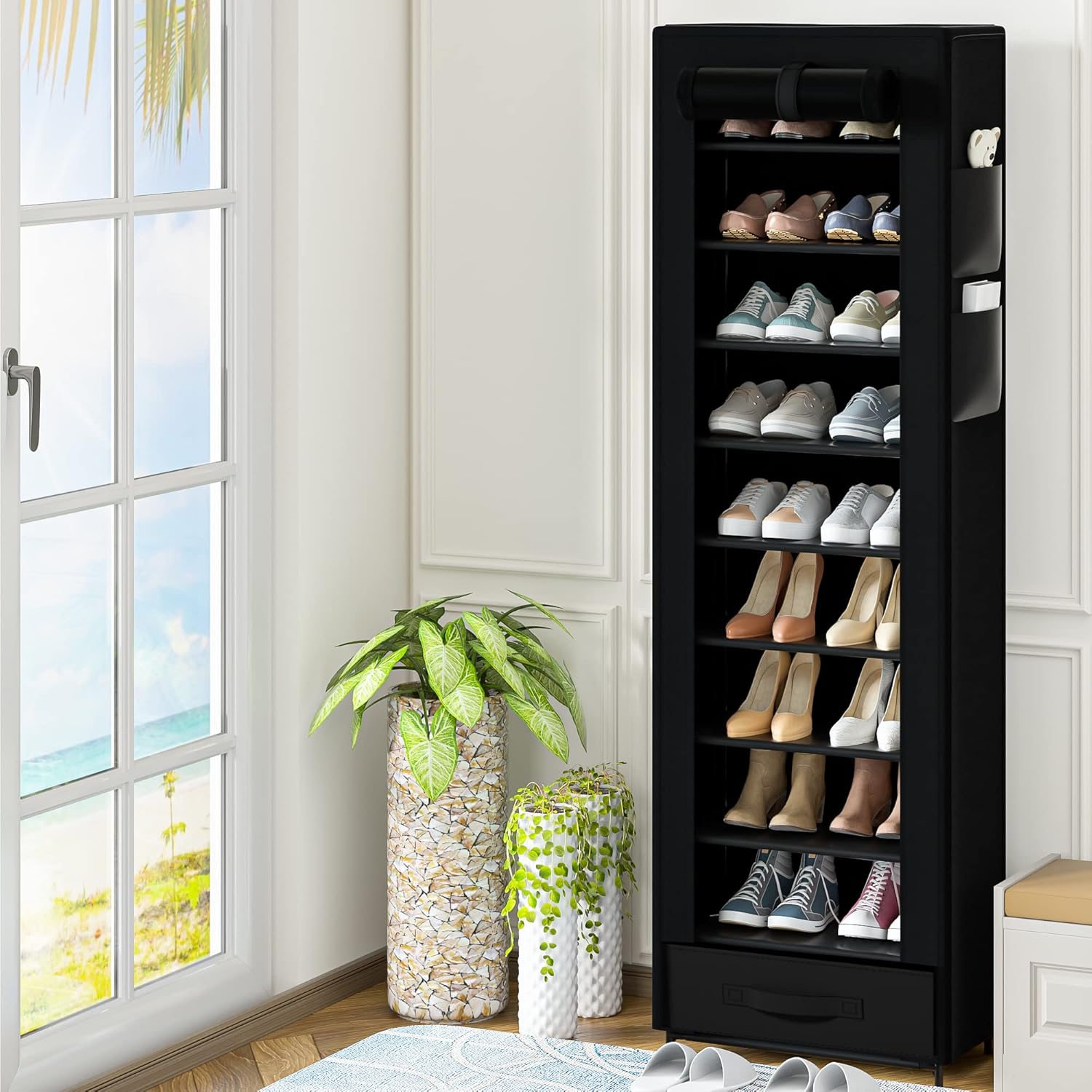 - Makes vertical shoe rack organizer better use of a small space:The compact shoe rack tall narrow takes up very little floor space and free standing shoe racks for closets, entryway, dormitory, apartment, hallway, wardrobe, or some other temporary space,also as garage shoe rack small space. The shoe rack covered 10 tier shoe tower organizer, as entryway shoe rack or shoe shelf for closet, or front door shoe rack zapatera organizador.