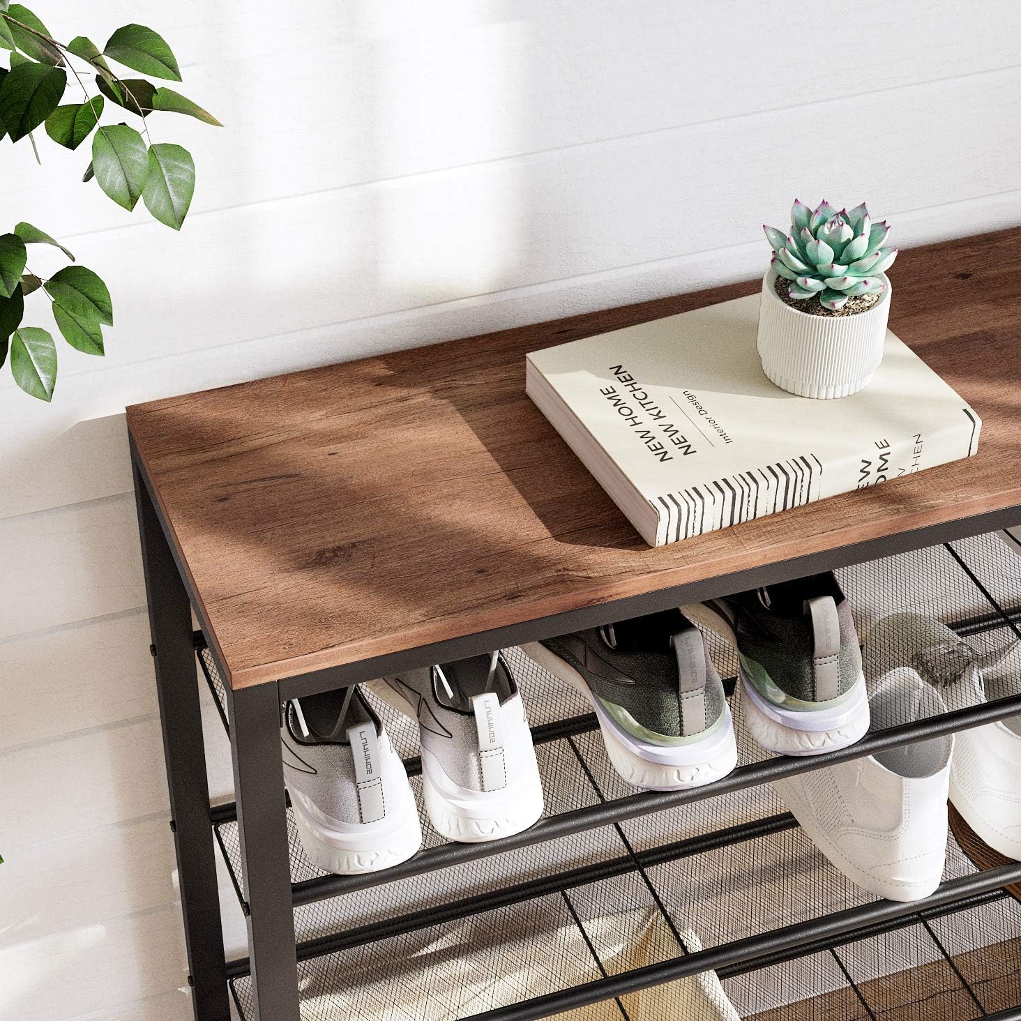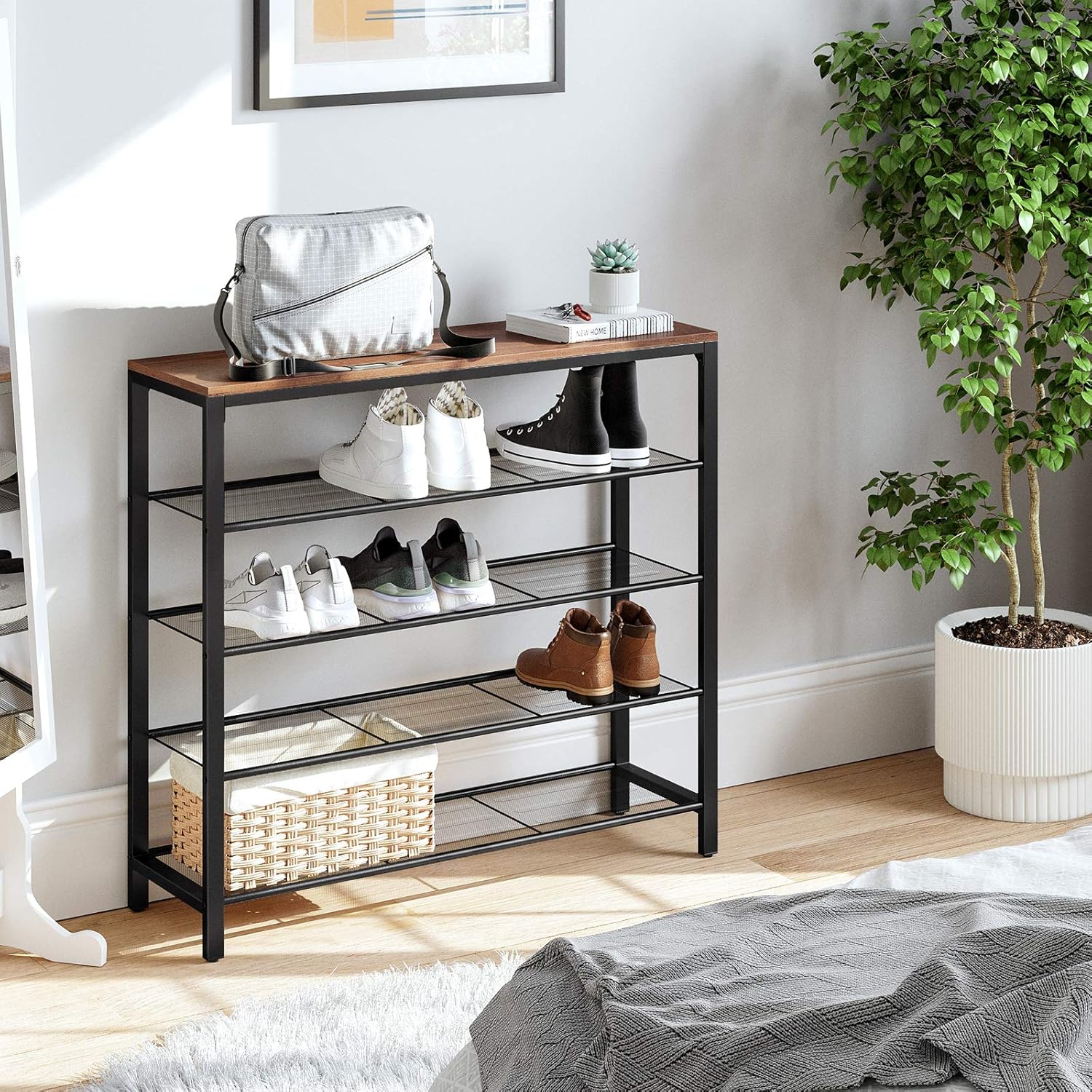 - [Strong Design] 4 open shelves with dense steel mesh offer plenty of space for your shoes; the eye-catching hazelnut brown surface welcomes bags, keys, picture frames, or a bouquet of roses (top surface holds up to 22 lb, shoe shelves up to 11 lb each)
