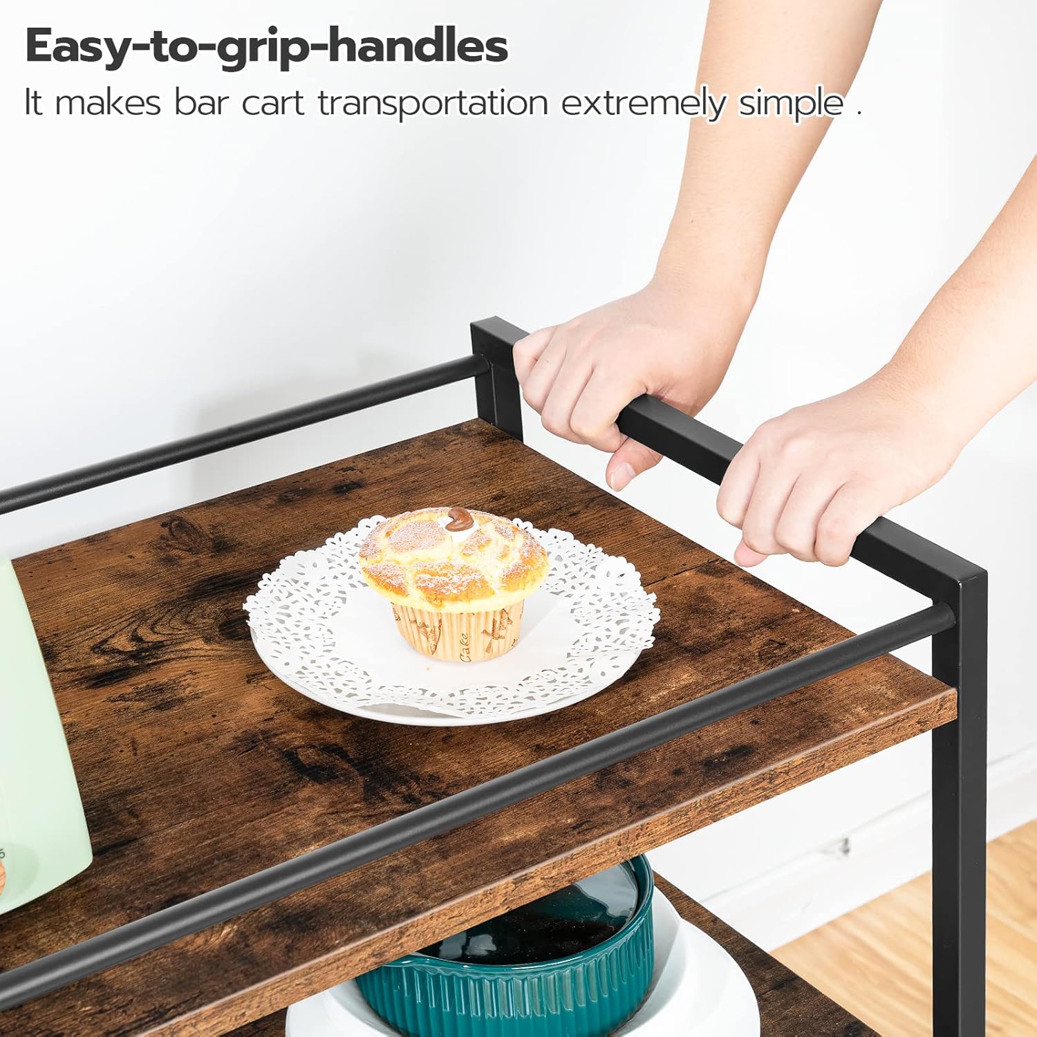 HOOBRO Bar Cart for The Home, Serving Cart with Wine Glass Hooks, Rolling Kitchen Cart with Lockable Wheels, 25.2 x 15.7 x 33.3 Inches Beverage Cart with Storage Shelves, Rustic Brown BF02TC01