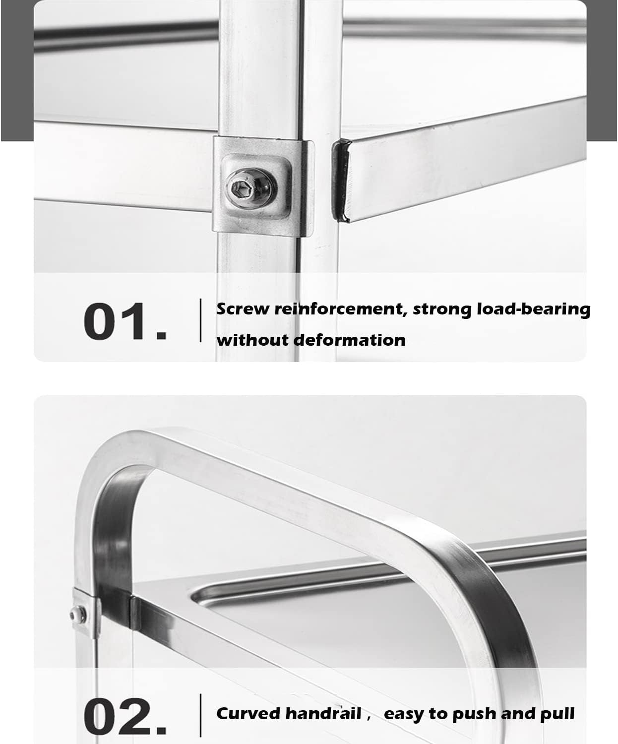 - High-quality Serving Trolley cart : Made of thick stainless steel, high-strength steel buckle connection between layers and rods, load-bearing is not deformed,and the four edges of each layer of partition have groove design, which can prevent your goods from falling and damaging during