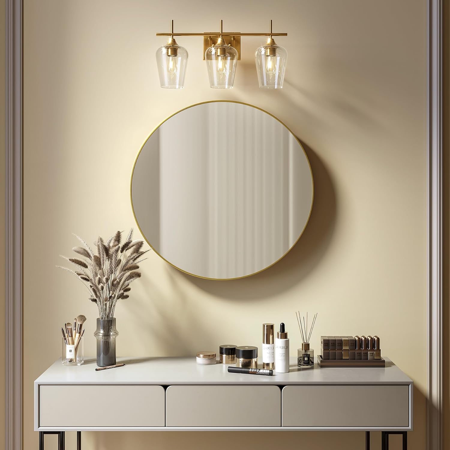 - Timeless Modern Design: This 3-light vanity light blends modern industrial style with minimalist elegance. Made with gold-finish metal and clear glass shades, it adds a sleek, contemporary touch to enhance any room’s aesthetic