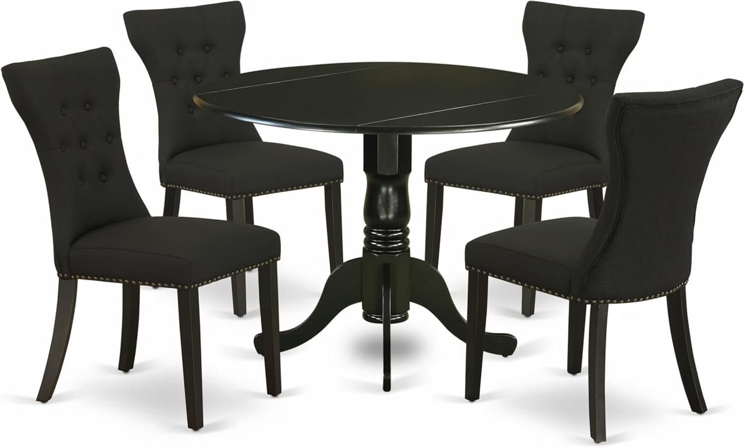 East West Furniture DLGA5-BLK-24 5 Piece Kitchen Table Set for 4 Includes a Round Dining Room Table with Dropleaf and 4 Black Linen Fabric Upholstered Chairs, 42x42 Inch, Black