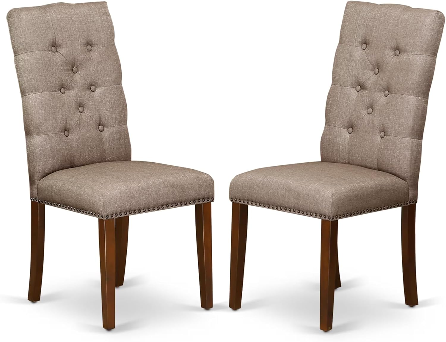 - DINNER TABLE SET FINISH: Our dining table set is coated in a rich mahogany color that is versatile with any decor. This fashionable kitchen table and kitchen parson chairs set exudes a luxurious and retro look with its stunning color. The upholstered dining chairs feature a high, stylish button-tufted back with a dark khaki-colored linen fabric seat cover and fabulous wooden mahogany-colored legs. The dining room tabletop and beautiful wooden legs are finished with a mahogany finish.