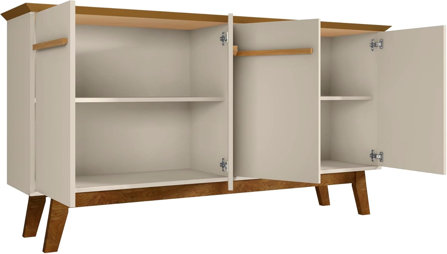 Manhattan Comfort Yonkers Mid Century Modern Sideboard Cabinet with Soft Close Doors, 4 Cubby Storage Spaces, Solid Wood Splayed Legs, Versatile Accent Buffet Stand, Off White/Cinnamon