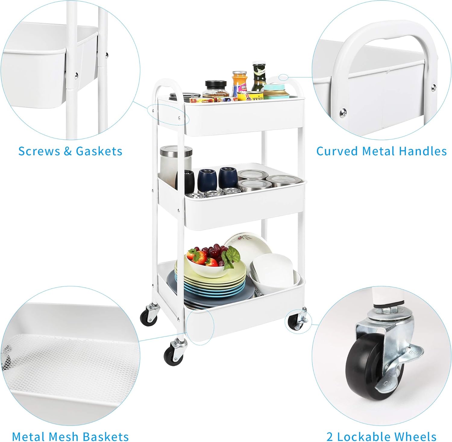 MAX Houser 3-Tier Rolling Utility Cart with Caster Wheels,Easy Assembly, for Kitchen, Bathroom (White)
