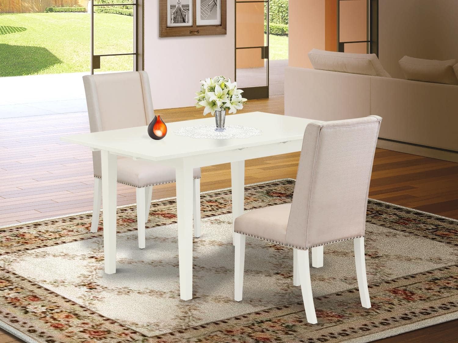 East West Furniture NOFL3-LWH-01 3 Piece Dinette Set for Small Spaces Contains a Rectangle Butterfly Leaf Table and 2 Cream Linen Fabric Upholstered Chairs, 32x54 Inch, Linen White