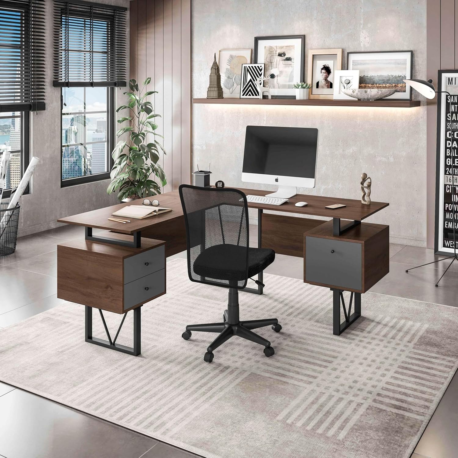 Techni Mobili Reversible L Shaped Desk with File Cabinet and Drawers 59” W – Modern Versatile L Shaped Office Desk with Drawers and File Cabinet - Brown