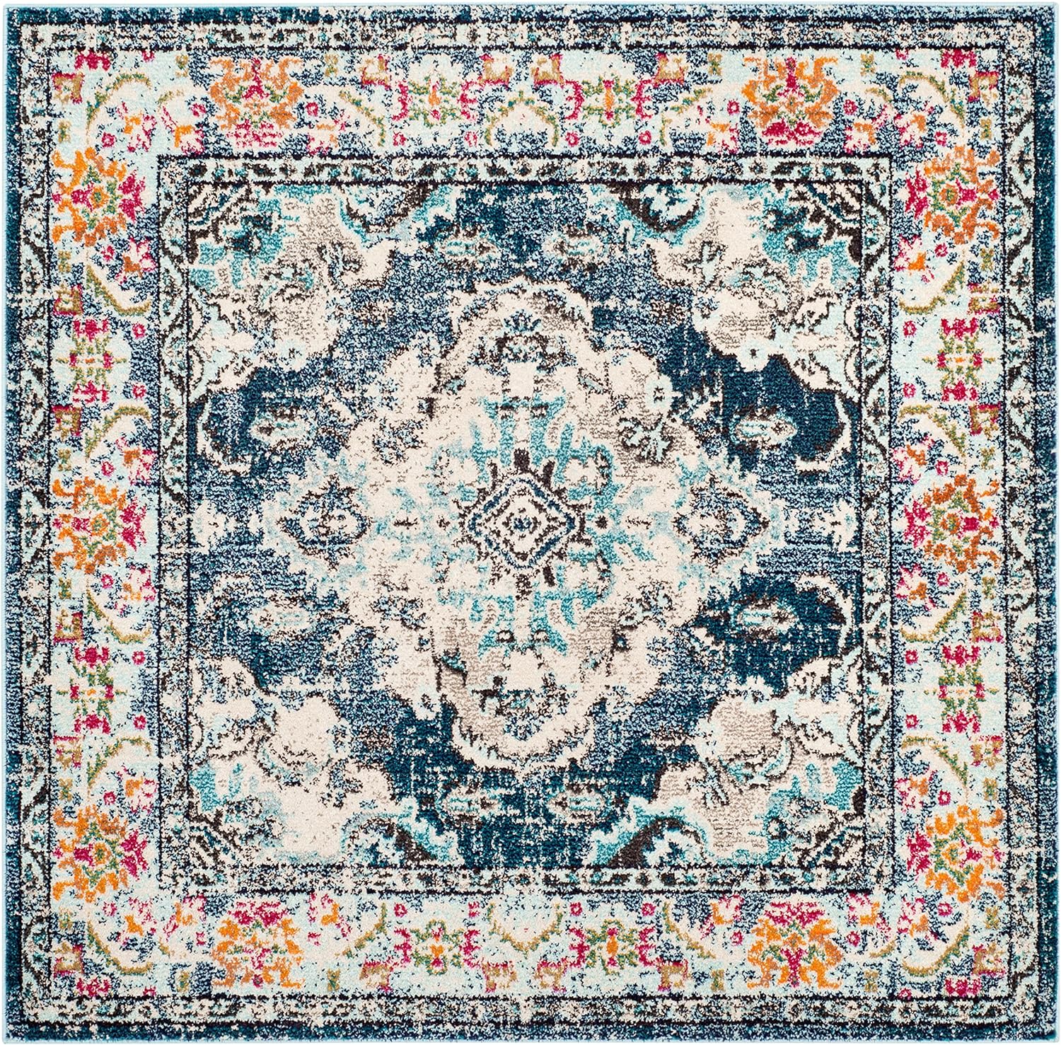 SAFAVIEH Monaco Collection Area Rug - 4' Square, Navy & Light Blue, Boho Chic Medallion Distressed Design, Non-Shedding & Easy Care, Ideal for High Traffic Areas in Living Room, Bedroom (MNC243N)